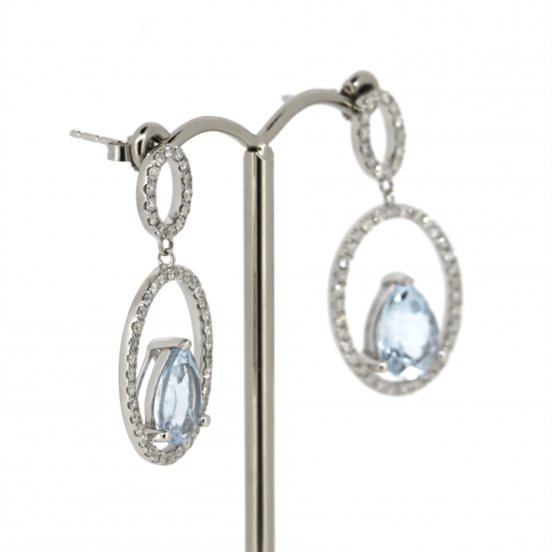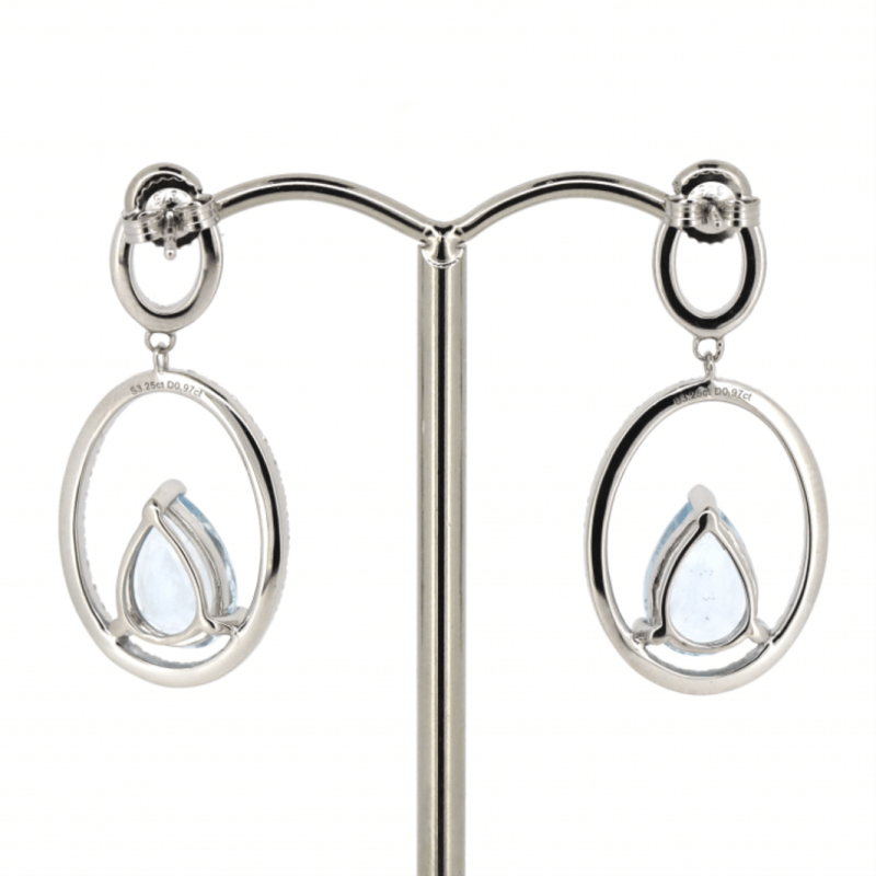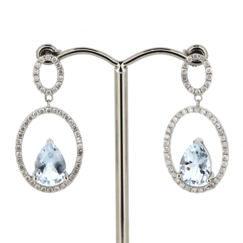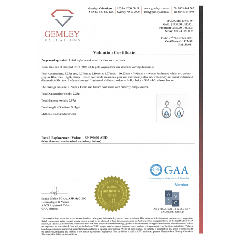 14K WHITE GOLD, AQUAMARINE AND DIAMOND, DOUBLE HOOP DROP EARRINGS. The Design Features, 2 Pear Cut, Light Greyish-Blue, Aquamarines (3.25Ct Tsw, Minor Eye Visible Inclusions), 3 Claw Set. Decorating The Design In Double Oval Hoops Are, 96 Round Brilliant Cut, Diamonds (0.97Ct Tdw, J-K Colour, Si2-I2 Clarity), Micro-Claw Set. The Earrings Have Post Backs, With 14K White Gold Butterfly Clasps. Valuations Provided by an Independent Third-Party Professional Not Directly Associated With Lloyds Auctions at AUD $$9,190.00This valuation has been conducted by an independent third-party professional. The valuation amount is an assessment by the issuing valuer and does not reflect the auction value of the item. Any inquiries regarding the valuation should be directed to the issuing valuer (refer to contact details on the certificate), as Lloyds Auctions has no affiliation or influence over the valuation, the valuer, or the stated amount. Condition: Good - Refer Images 0+1516