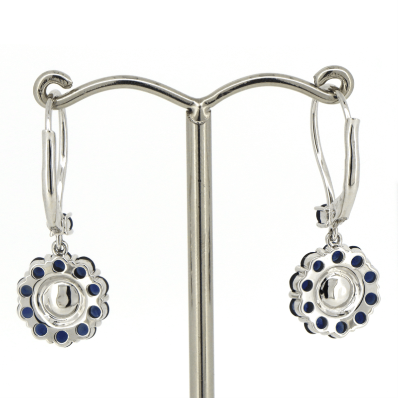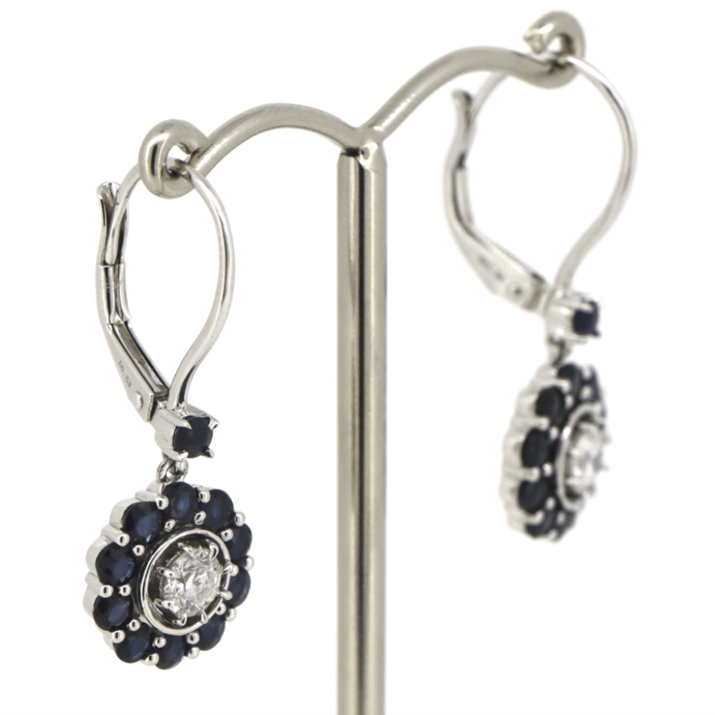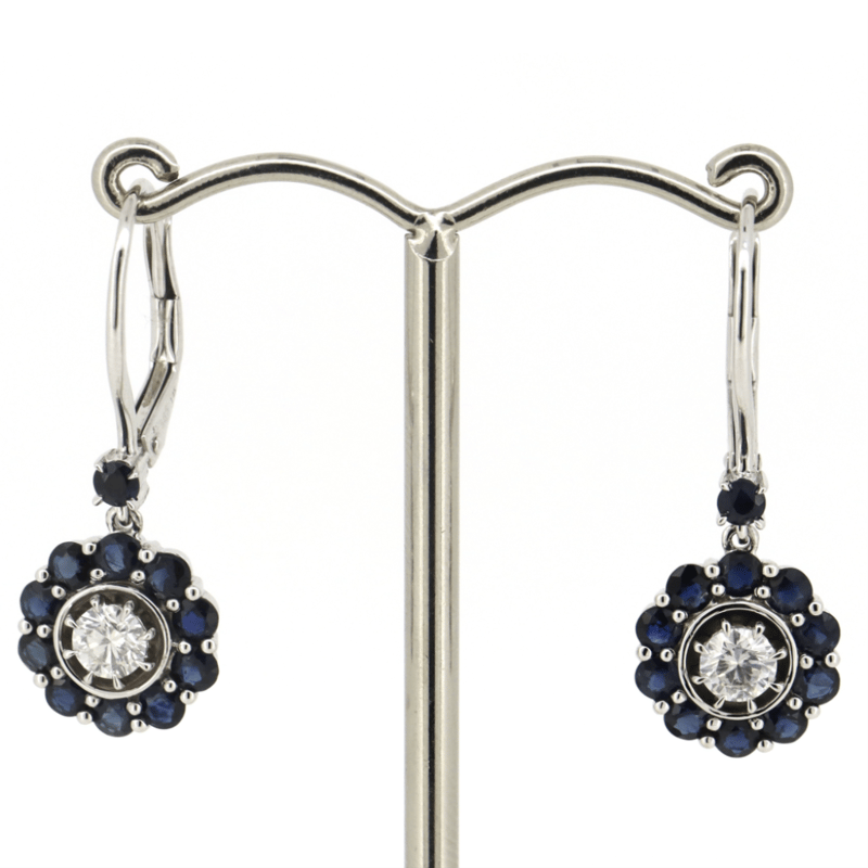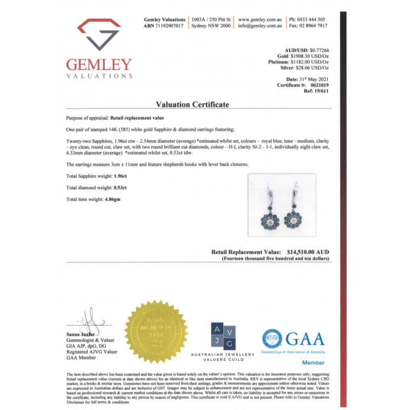 14K WHITE GOLD, BLUE SAPPHIRE AND DIAMOND, FLORAL EARRINGS. The Centres Feature, 2 Round Brilliant Cut, Diamonds (0.53Ct Tdw, H-I Colour, Si2-I1 Clarity), Multi Claw Set. Surrounding The Centres In Floral Designs And Decorating The Drops Are, 22 Round Cut, Medium Royal Blue, Sapphires (1.96Ct Tsw, Eye Clean Clarity), Bead/Claw Set. The Earrings Have Shepherd Hooks. Valuations Provided by an Independent Third-Party Professional Not Directly Associated With Lloyds Auctions at AUD $$14,510.00This valuation has been conducted by an independent third-party professional. The valuation amount is an assessment by the issuing valuer and does not reflect the auction value of the item. Any inquiries regarding the valuation should be directed to the issuing valuer (refer to contact details on the certificate), as Lloyds Auctions has no affiliation or influence over the valuation, the valuer, or the stated amount. Condition: Good - Refer Images 0+1593