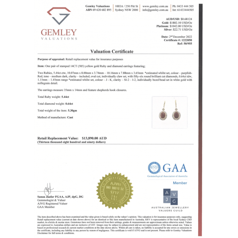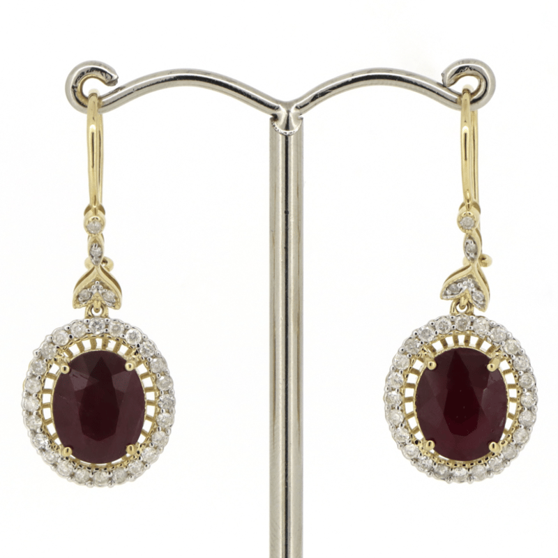 14K YELLOW GOLD, RUBY AND DIAMOND, DROP EARRINGS. The Centres Feature, 2 Oval Cut, Purplish-Red, Rubies (5.44Ct Tsw, Included), 4 Claw Set. Surrounding The Stones In Halos And Decorating The Hooks/Joins Are, 56 Round Brilliant Cut, Diamonds (0.64Ct Tdw, J-K Colour, Si2-I2 Clarity), Bezel/Bead Set In White Gold With Millegrain Detail. The Earrings Have Shepherds Hooks With 'C' Hook Closures. Valuations Provided by an Independent Third-Party Professional Not Directly Associated With Lloyds Auctions at AUD $$13,890.00This valuation has been conducted by an independent third-party professional. The valuation amount is an assessment by the issuing valuer and does not reflect the auction value of the item. Any inquiries regarding the valuation should be directed to the issuing valuer (refer to contact details on the certificate), as Lloyds Auctions has no affiliation or influence over the valuation, the valuer, or the stated amount. Condition: Good - Refer Images 0+1589