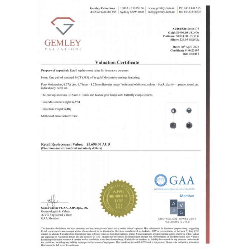 14K WHITE GOLD, BLACK MOISSANITE, CHAIN DROP EARRINGS. The Earrings Feature, 4 Round Cut, Black, Moissanites (6.57Ct Tsw, Opaque), Bezel Set. The Earrings Have Post Backs With 14K White Gold Butterfly Clasps. Valuations Provided by an Independent Third-Party Professional Not Directly Associated With Lloyds Auctions at AUD $$5,690.00This valuation has been conducted by an independent third-party professional. The valuation amount is an assessment by the issuing valuer and does not reflect the auction value of the item. Any inquiries regarding the valuation should be directed to the issuing valuer (refer to contact details on the certificate), as Lloyds Auctions has no affiliation or influence over the valuation, the valuer, or the stated amount. Condition: Good - Refer Images 0+1512