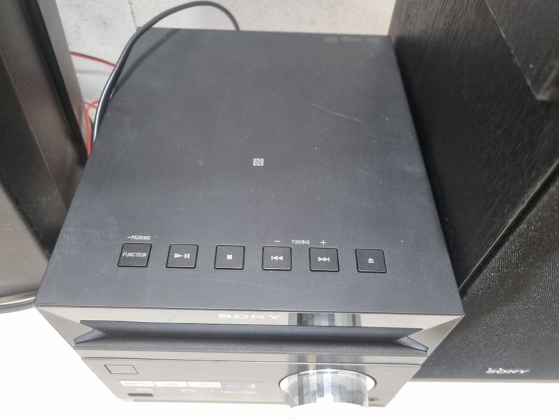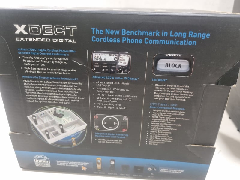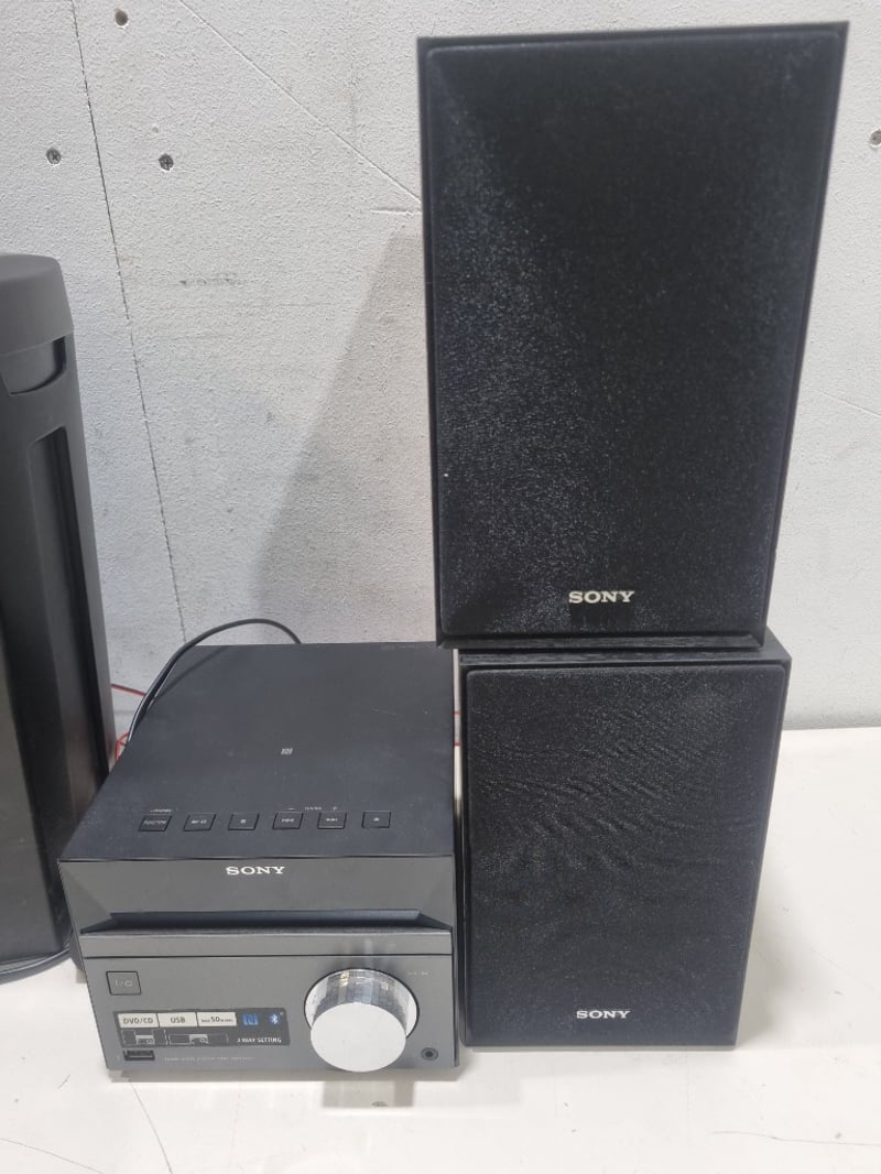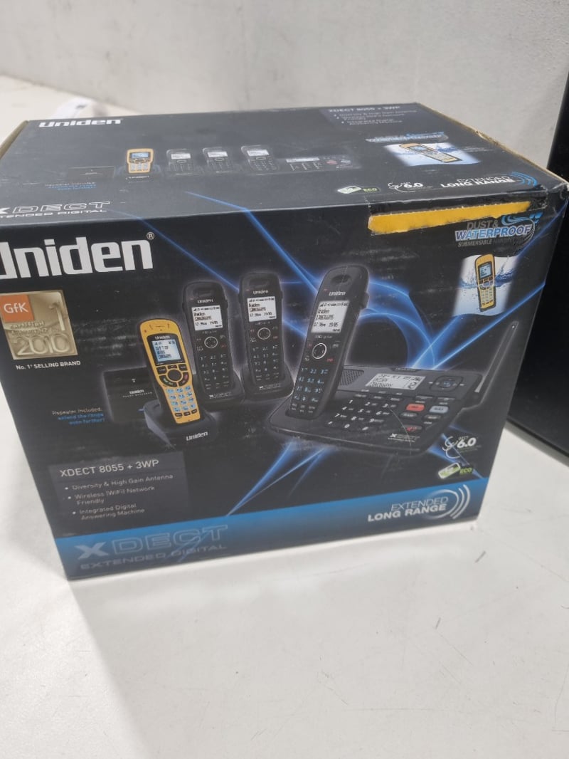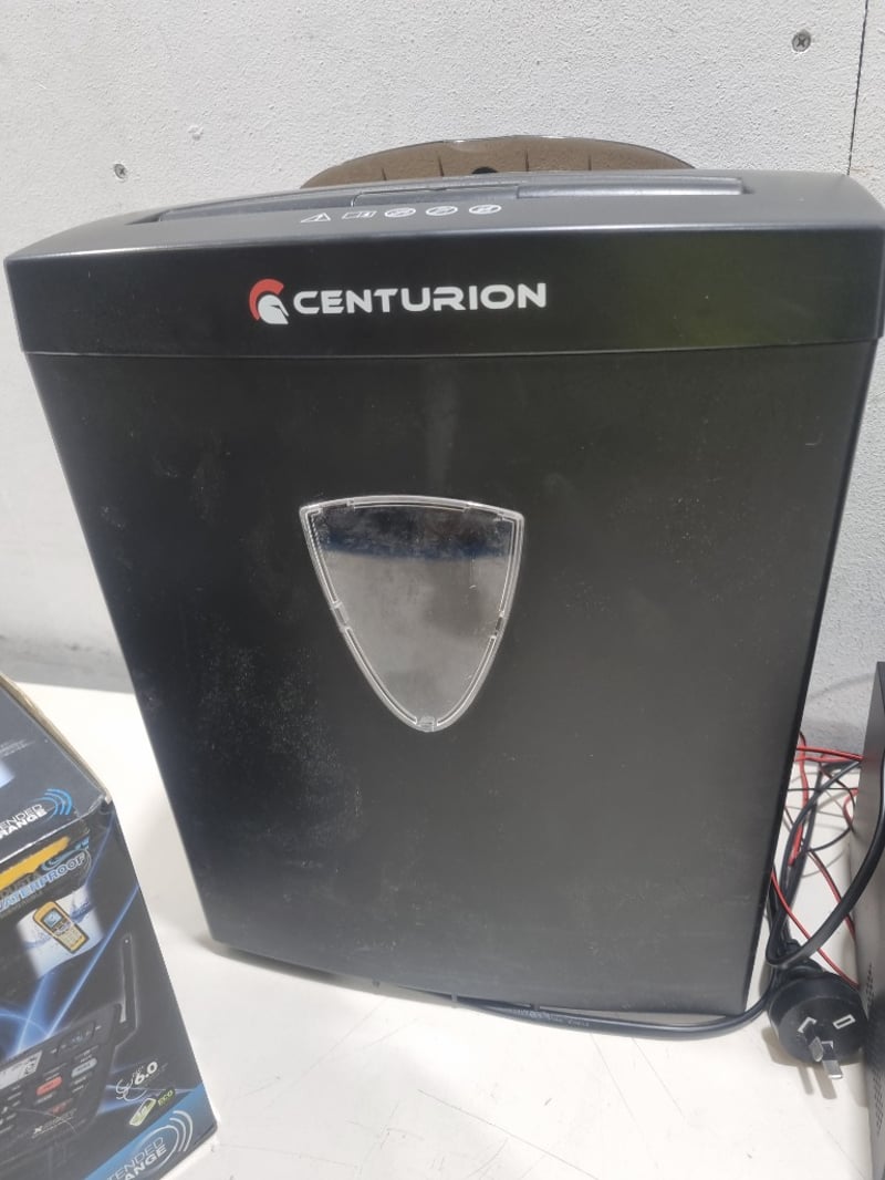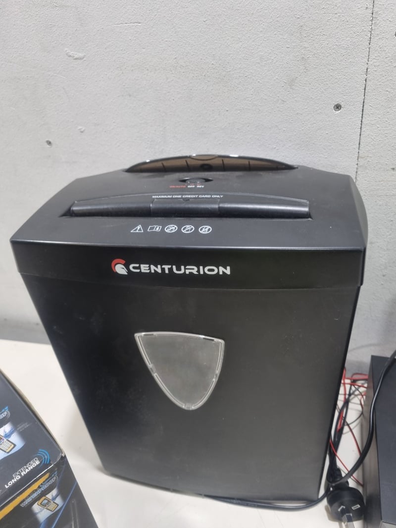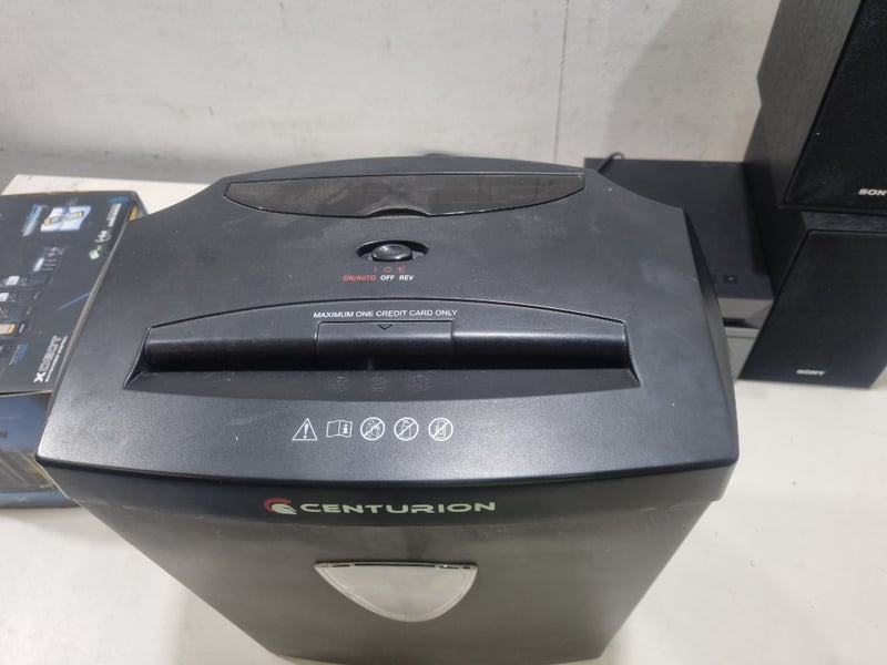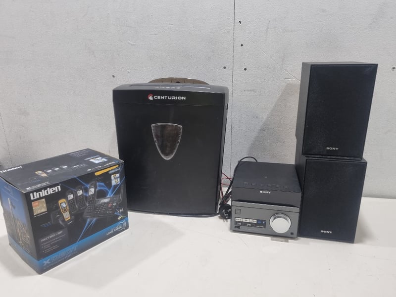 Comprehensive electronics collection featuring Uniden XDECT 8055 + 3WP extended digital cordless phone system with waterproof handsets and long-range capability; Centurion paper shredder (cross-cut, credit card capable); Sony micro hi-fi system with DVD/CD receiver (model HCD-SBT40D), compact disc player with 2-way speaker configuration and volume control; Sony satellite speaker pair; vintage cassette-based answering machine with call block functionality. All items pictured with original Uniden XDECT packaging visible. Mixed-use bundle suitable for home office or small business application. Equipment shows visible wear consistent with age and use.Sold as lot