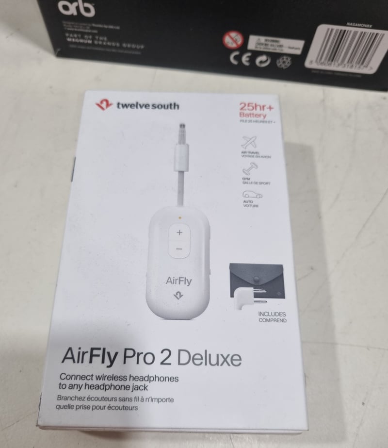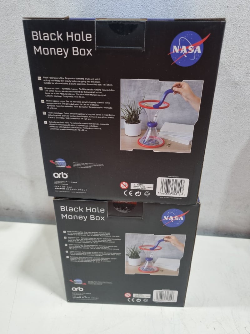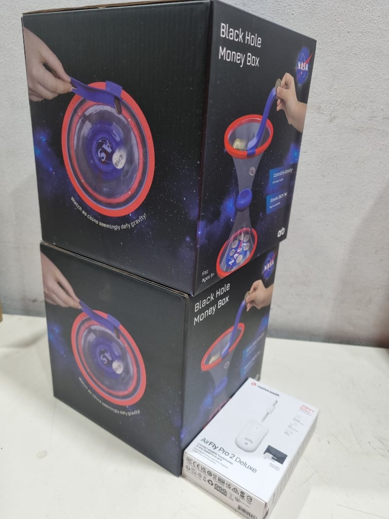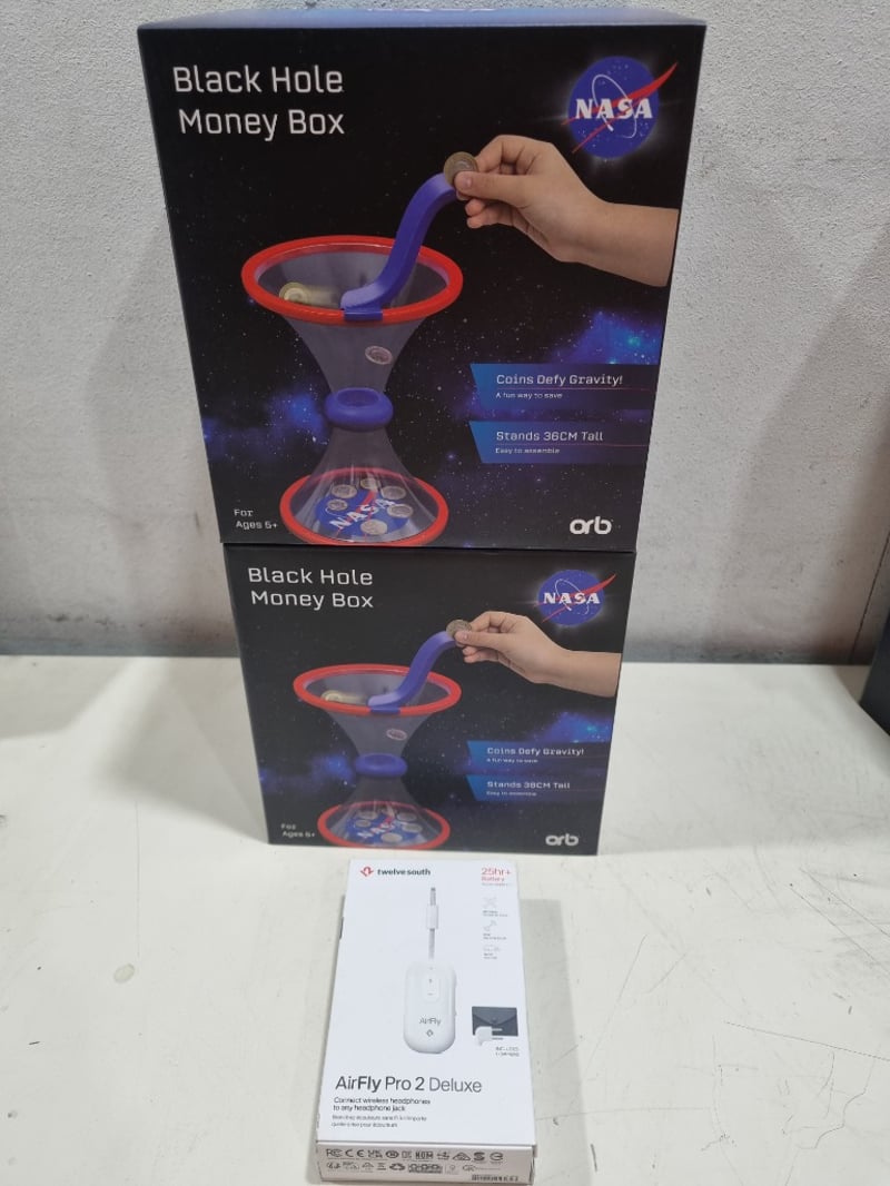 NASA-licensed Black Hole Money Box educational toys by Orb, standing 38cm tall. Each features a gravity-defying coin mechanism with red outer ring and purple inner funnel chamber. Coins are inserted via the blue tube and appear to defy gravity as they orbit the black hole before dropping into the collection base. Includes integrated educational fact cards highlighting NASA space science content. Accompanied by one Twelve South AirFly Pro 2 Deluxe wireless headphone adapter with 25-hour battery life, featuring Bluetooth connectivity and 3.5mm jack compatibility. The adapter enables wireless audio streaming to any standard headphone jack. All items remain sealed in original retail packaging.