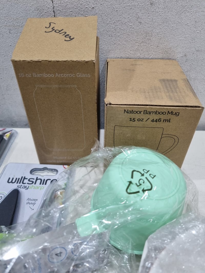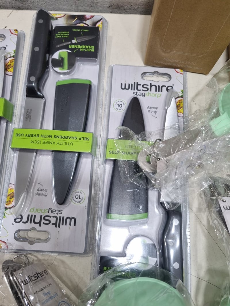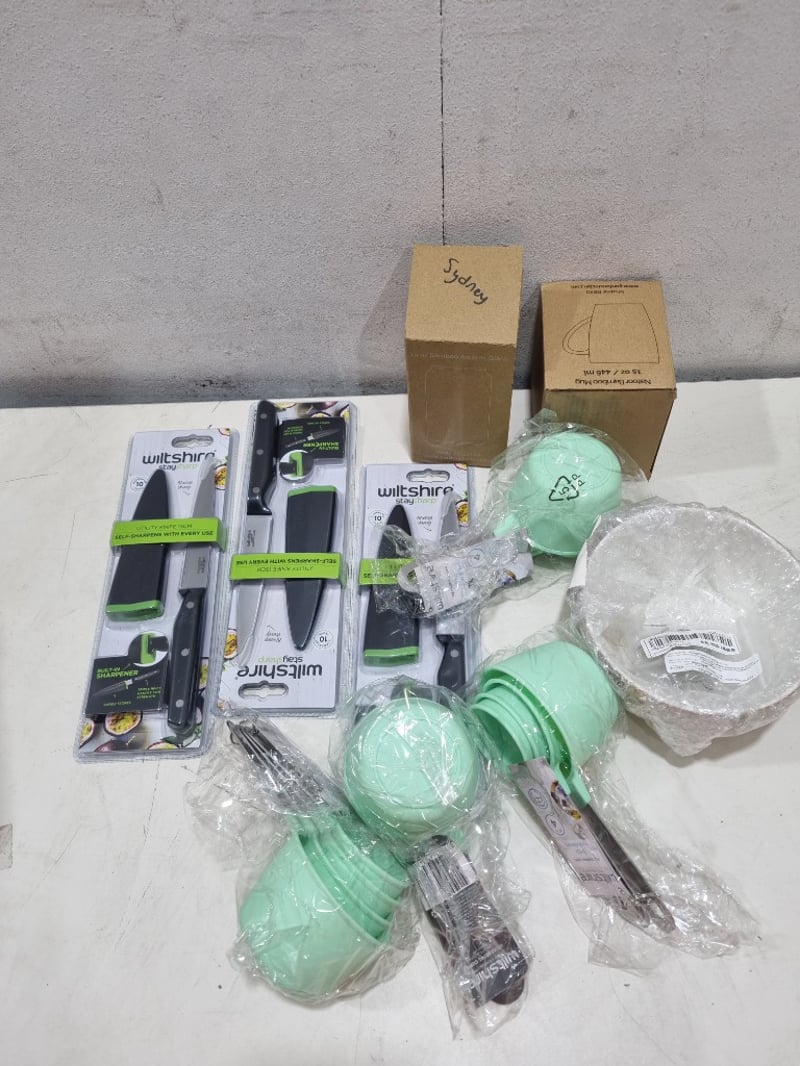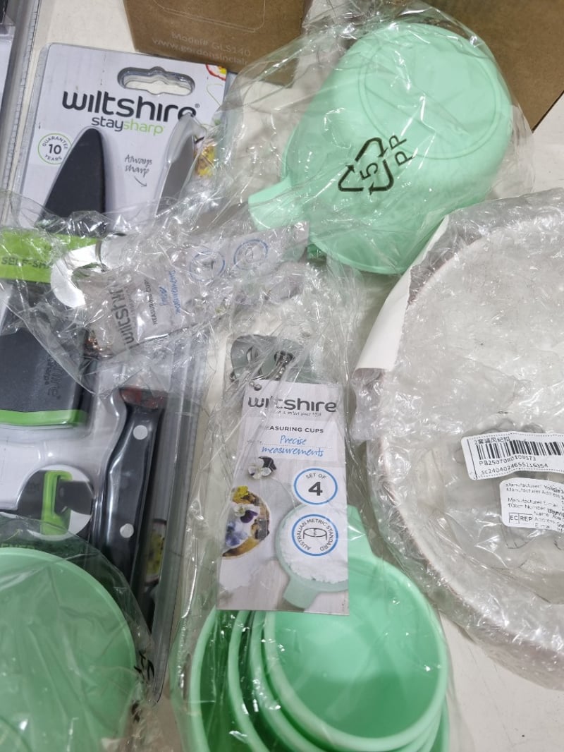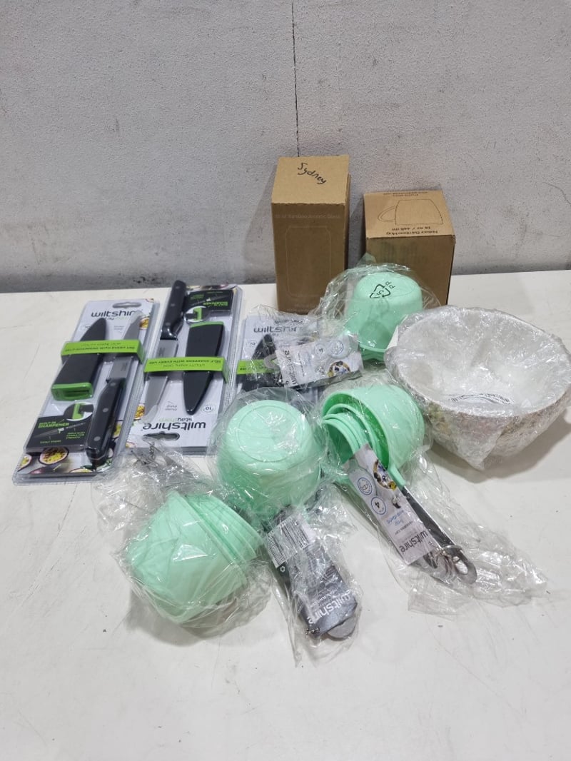 Bulk lot of kitchen essentials featuring Wiltshire brand cutlery and tableware. Includes multiple sets of self-sharpening kitchen knives with black handles and green accents (Stay Sharp technology), knife sharpeners, assorted measuring cups in mint green plastic with recycled material construction and two boxed bamboo drinkware items - a 10 oz Bamboo Aircoroc glass and a 15 oz (446 ml) Natoor Bamboo mug.