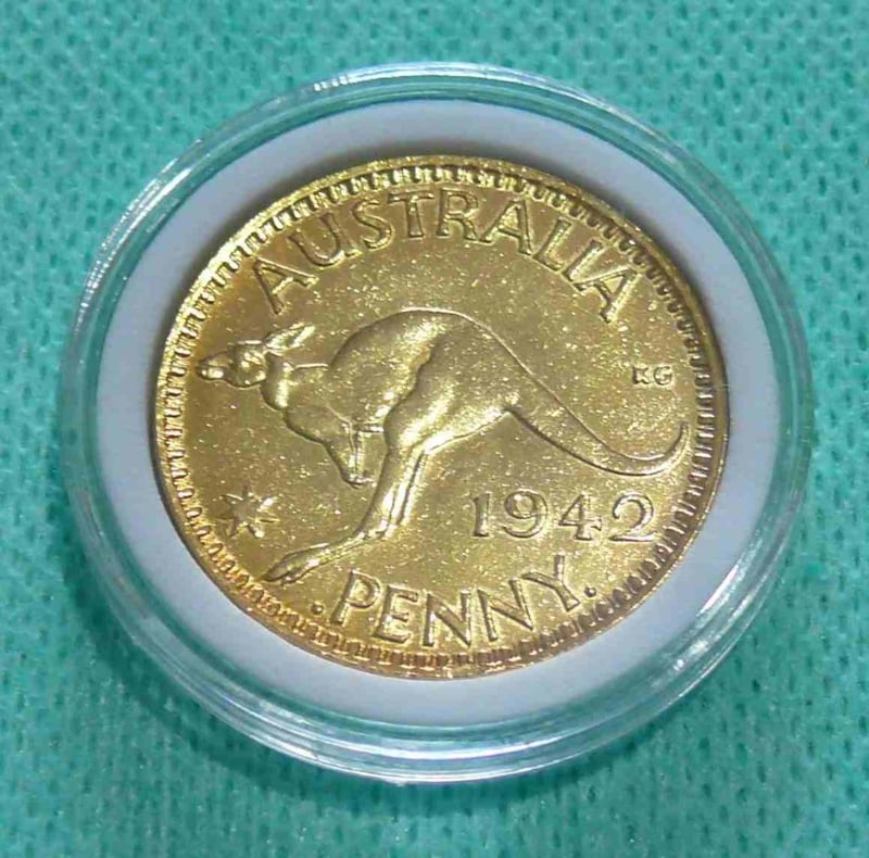 1942 KGVI UNCIRCULATED 18CT. GOLD PLATED AUSTRALIAN PENNY IN PROTECTIVE CLEAR CAPSULE. 488381+13