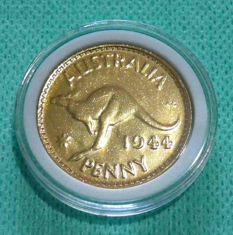 1944 KGVI UNCIRCULATED 18CT. GOLD PLATED AUSTRALIAN PENNY IN PROTECTIVE CLEAR CAPSULE. 488381+14