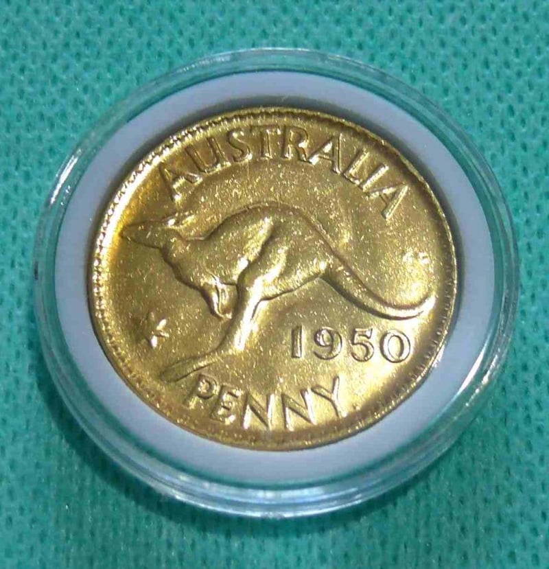 1950 KGVL UNCIRCULATED 18CT. GOLD PLATED AUSTRALIAN PENNY IN PROTECTIVE CLEAR CAPSULE. 488381+15