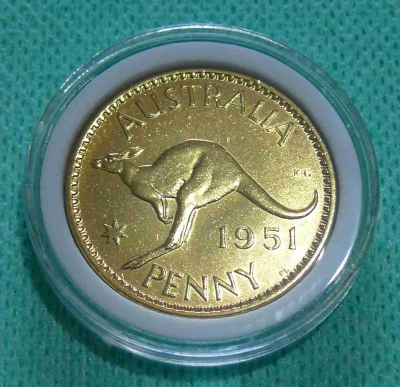 1951 KGVI UNCIRCULATED 18CT. GOLD PLATED AUSTRALIAN PENNY IN PROTECTIVE CLEAR CAPSULE. 488381+16