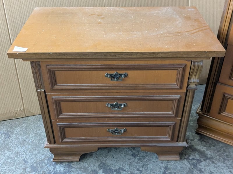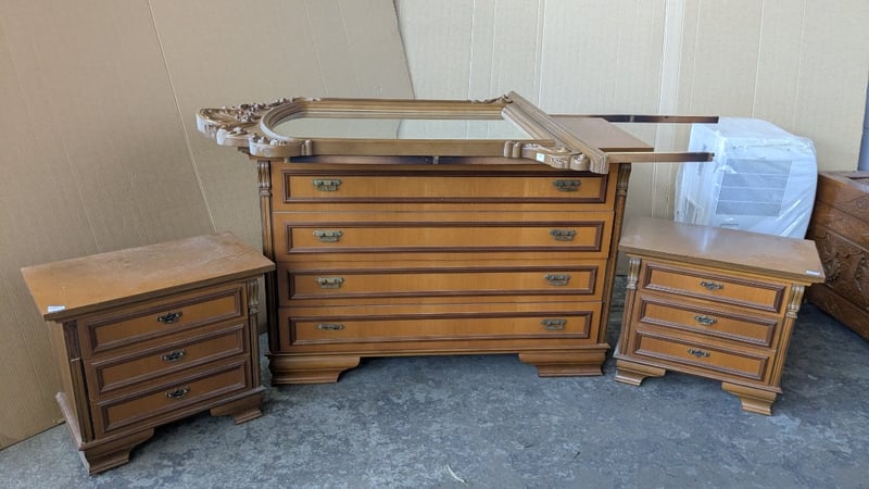 Furniture, including 2 x side tables and 1 x 4 drawer dresser with mirror