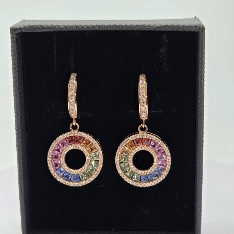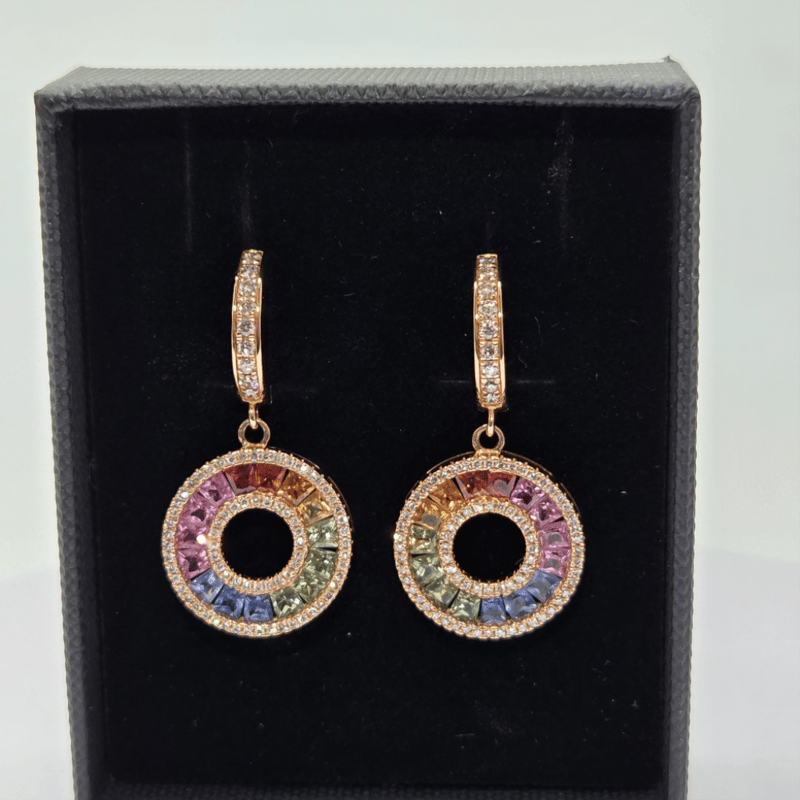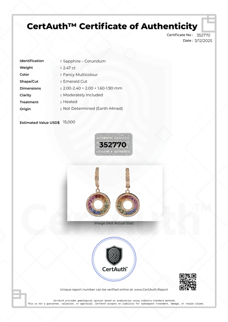 A Pair Of Hoop-Style Earrings Featuring 2.47 Carats Of Fancy Multicolour Sapphires (Corundum). The Gemstones Are Emerald Cut And Display A Beautiful Spectrum Of Colours. The Sapphires Are "Moderately Included" And Have Been Heated To Enhance Their Appearance. Includes Certauth Certificate Of Authenticity.