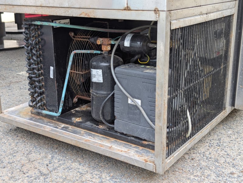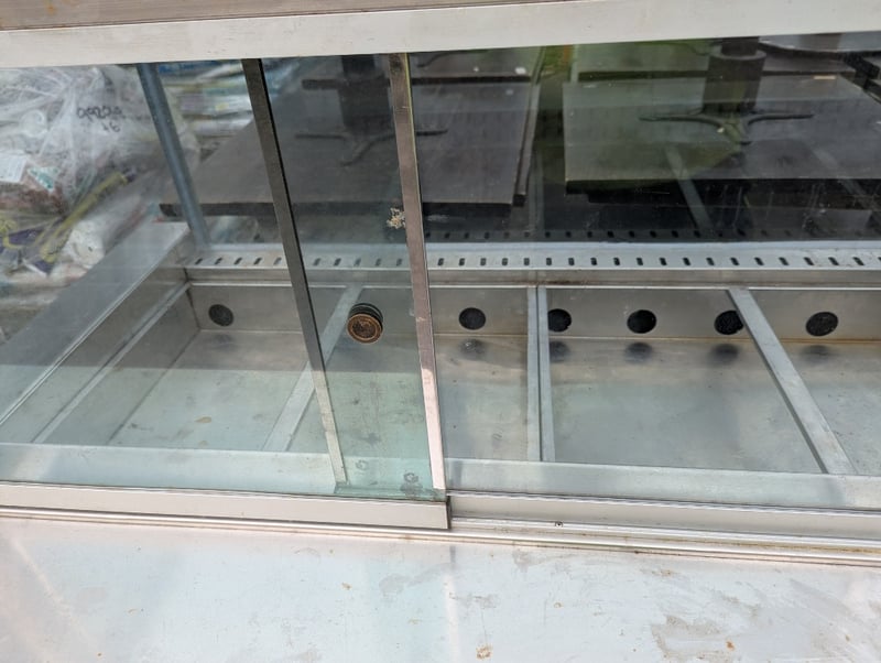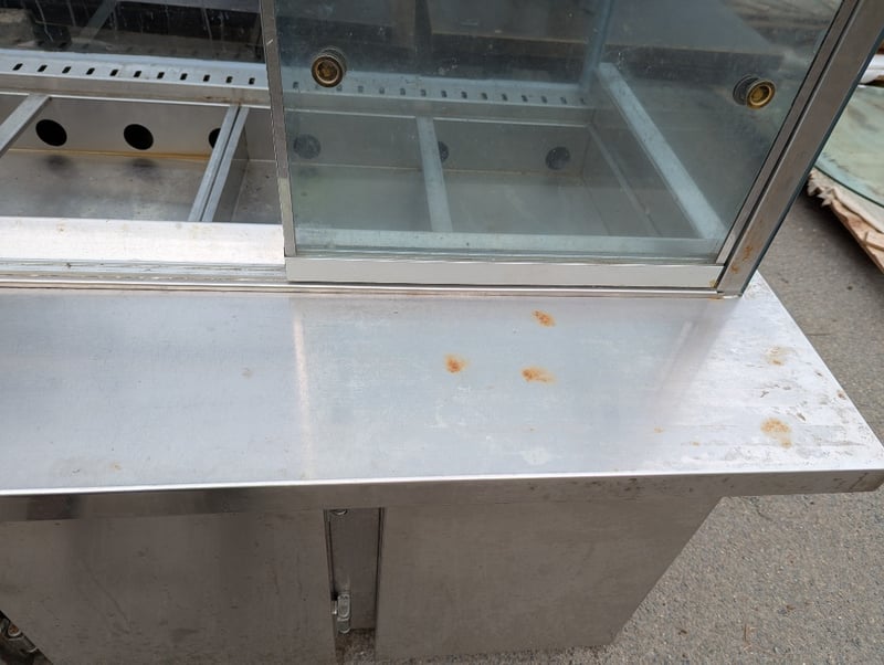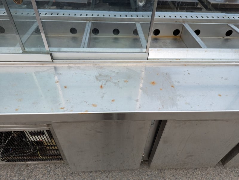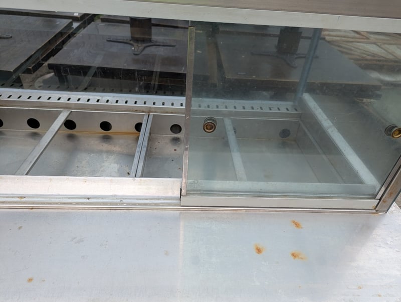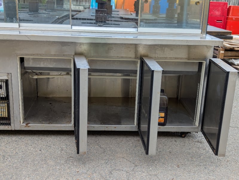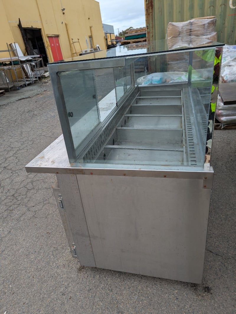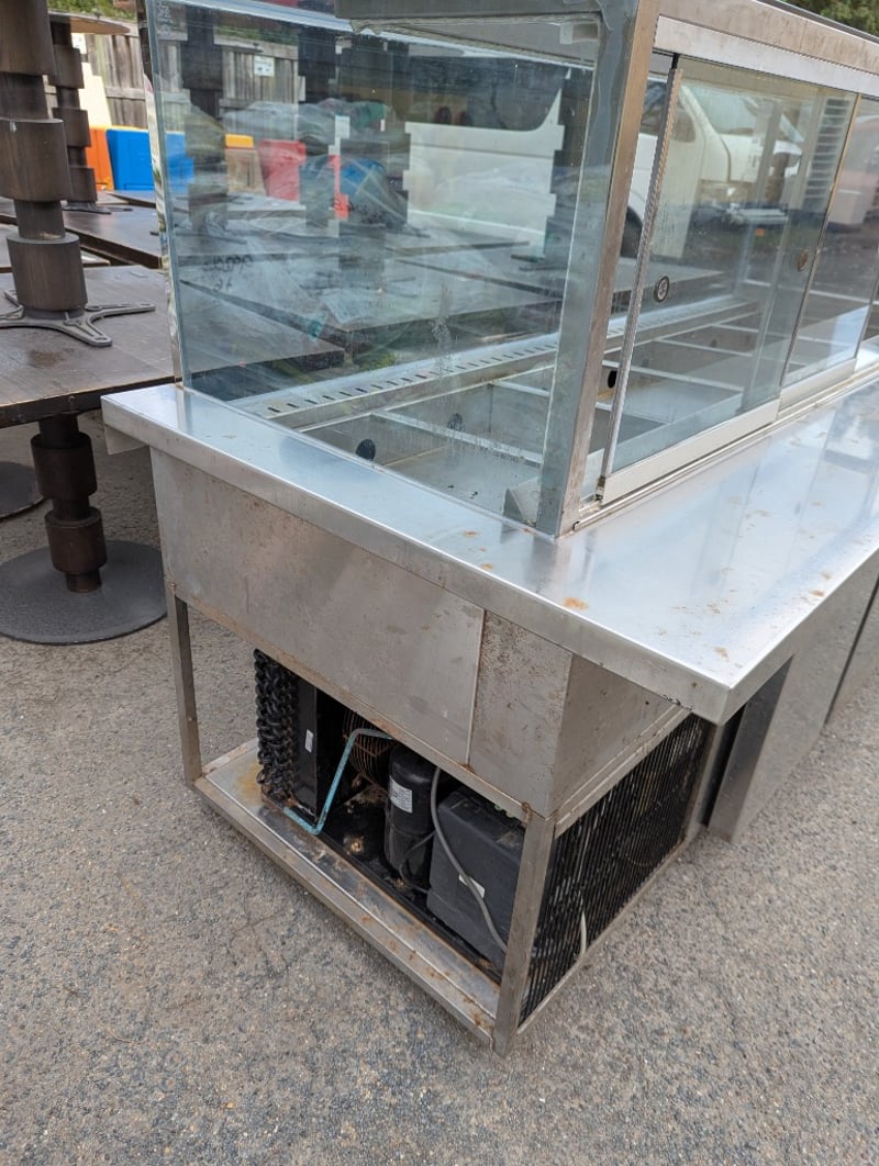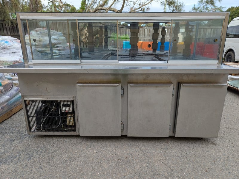 Salad bar, stainless steel, sliding glass doors at rear, 3 lower fridge doors, 6 tray compartments Note: Vendor advises in great working condition Dimensions: H 138.5cm x W 221cm x D 97.5cm