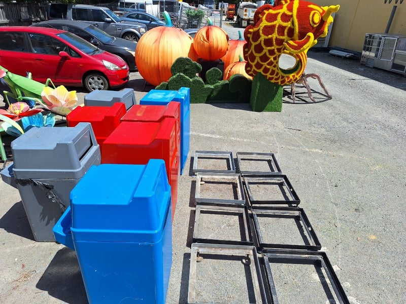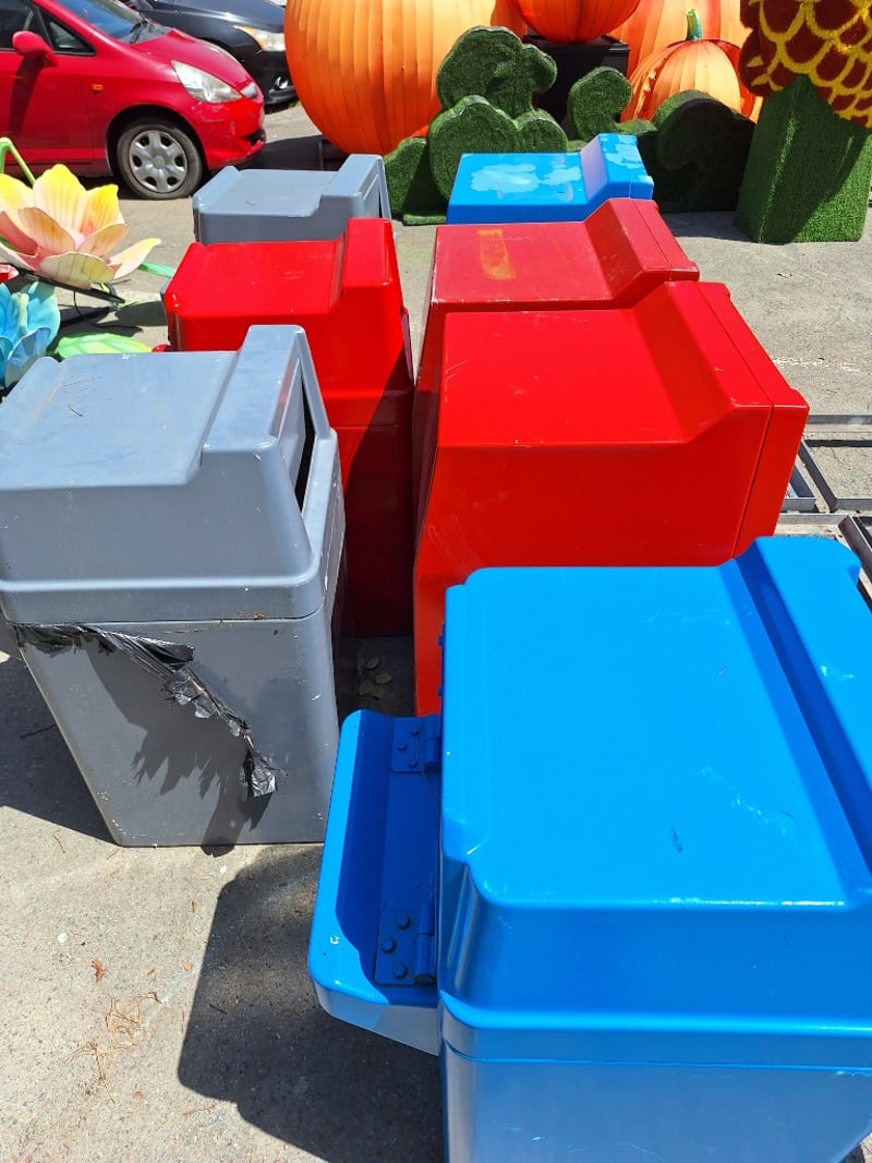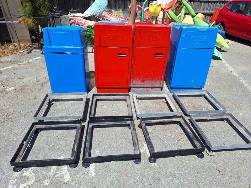 Rubbish Bins x7 & Bin bases x8, Red & Blue Finish