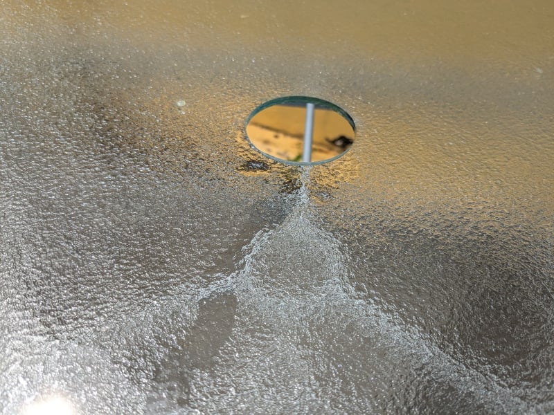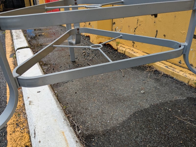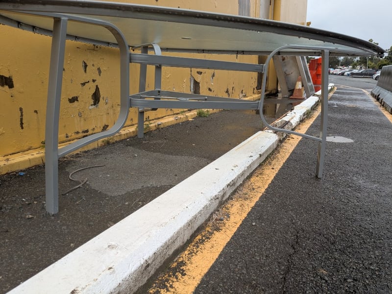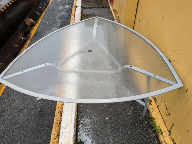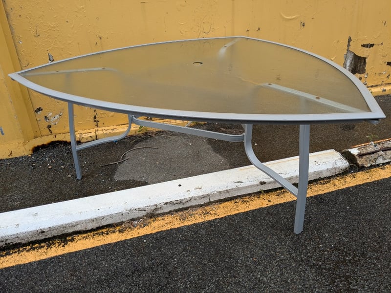 UNRESERVED Outdoor Table, Triangular, Grey Metal Frame, Frosted Glass Top.