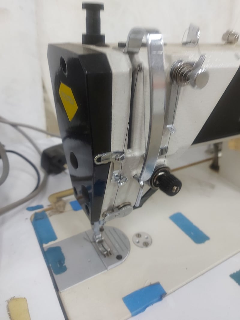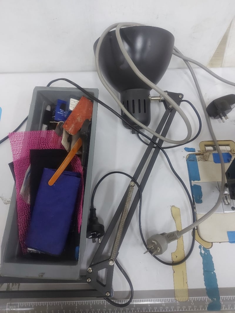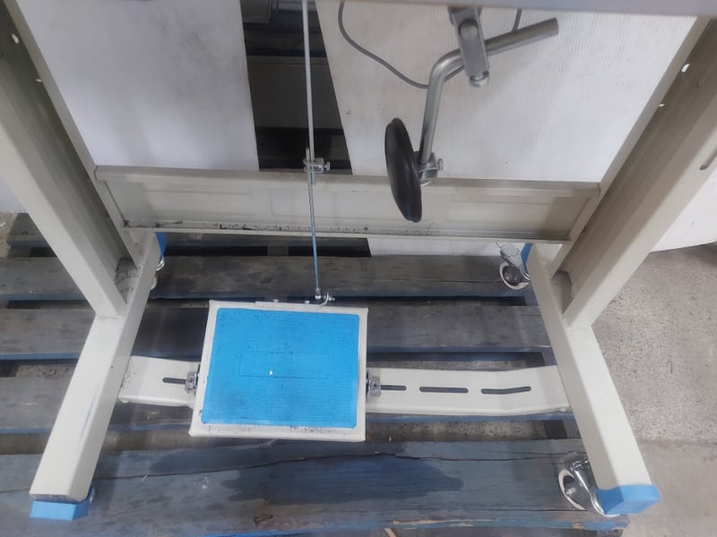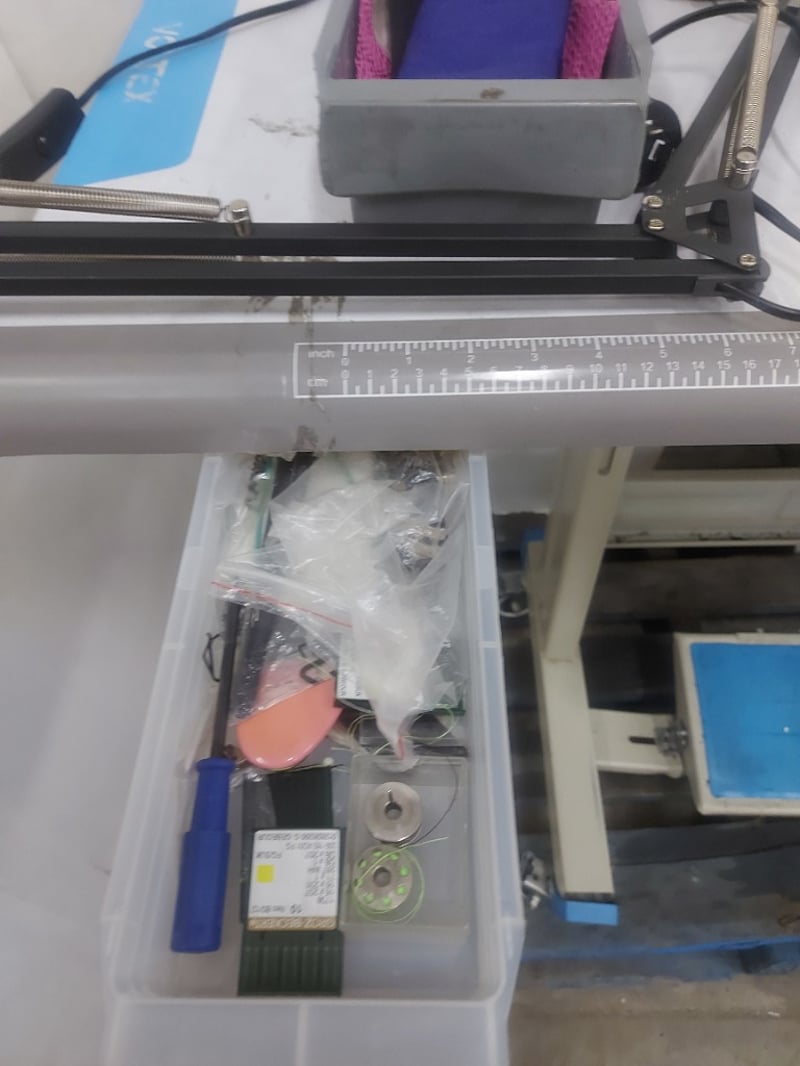 Sewing machine with desk and foot pedals+ small tray of assorted sewing equimpent and desk lampApproximate Dimensions: H 120cm x W 110cm x D 58cm