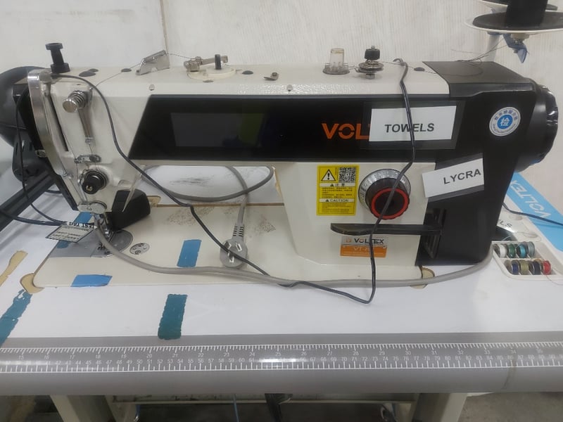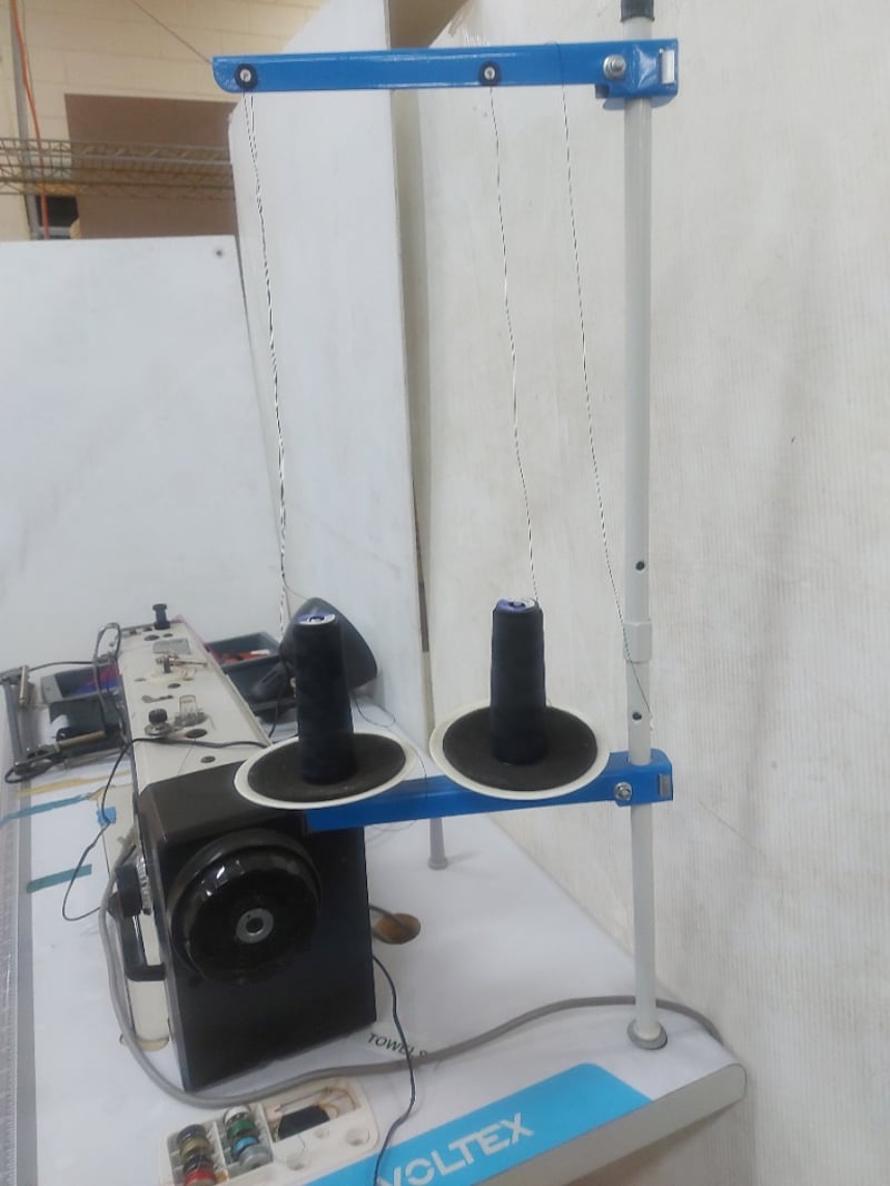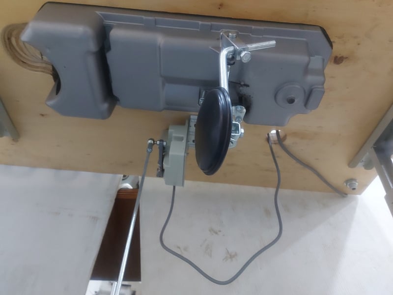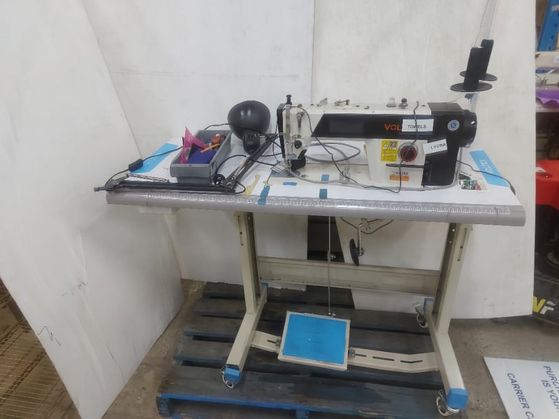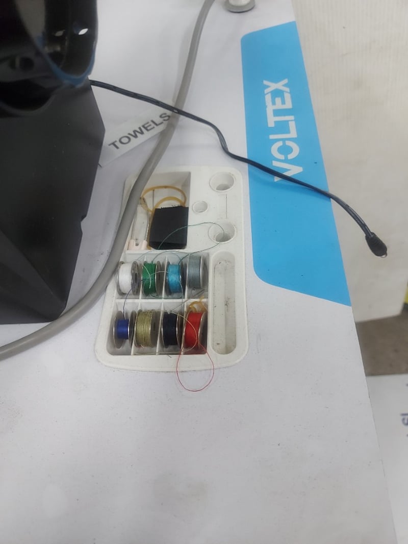 Sewing machine with desk and foot pedals+ small tray of assorted sewing equimpent and desk lampApproximate Dimensions: H 120cm x W 110cm x D 58cm