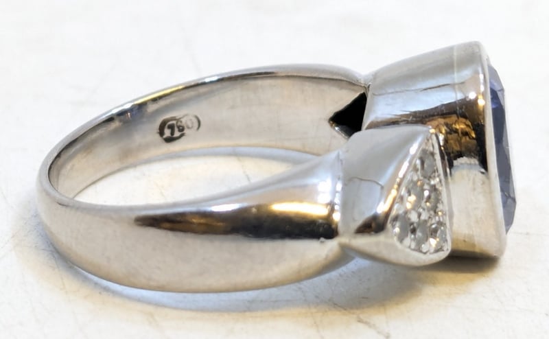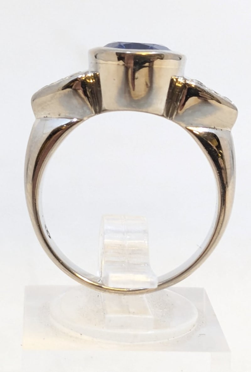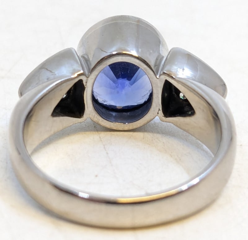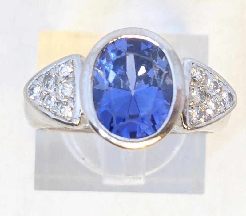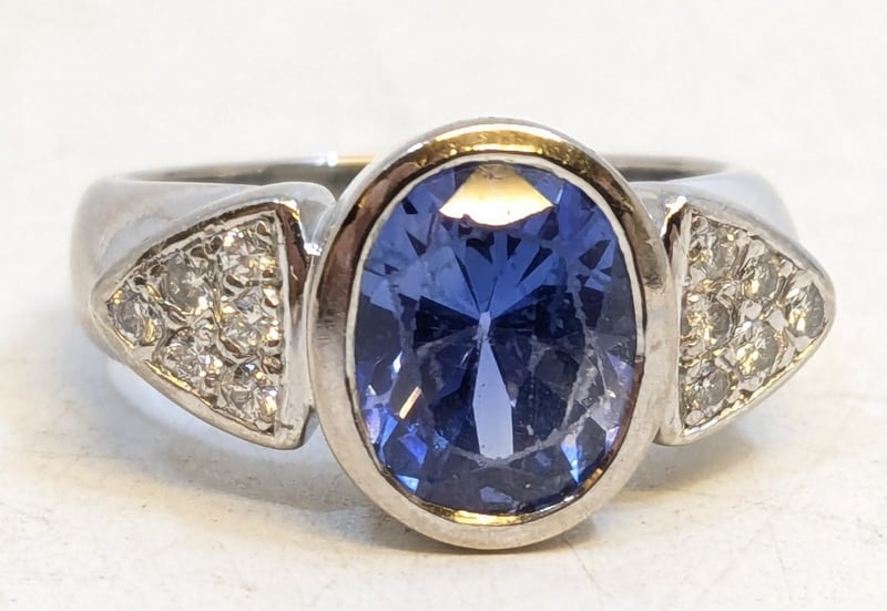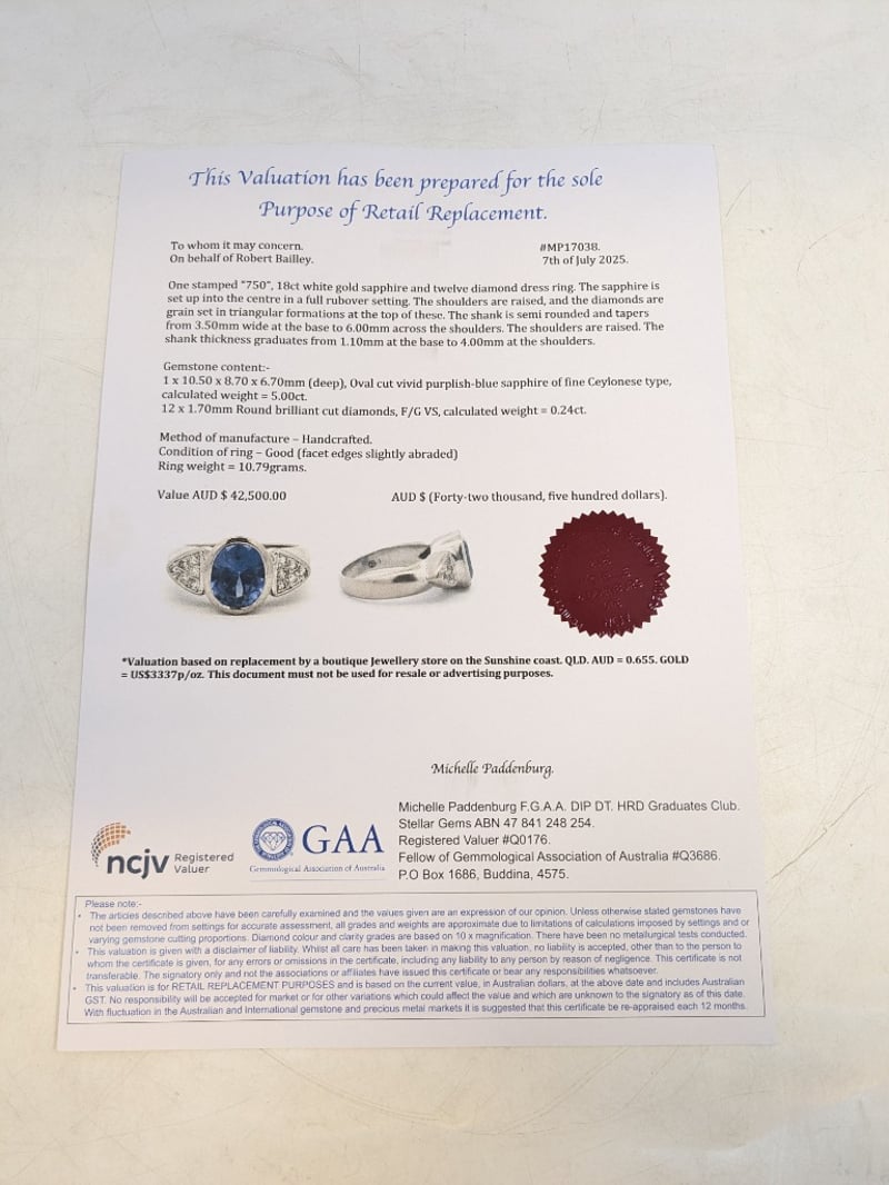 18CT WHITE GOLD SAPPHIRE AND DIAMOND DRESS RINGGemstone Content:1 X 10.5 X 8.7 X 6.7Mm (Deep), Oval Cut Vivid Purplish Blue Sapphire Of Fine Ceylonese Type, Weight = 5Ct12 X 1.7Mm Round Brilliant Cut Diamonds, F/G Vs, Weight = 0.24CtTotal Item Weight: 10.79gMarkings: Stamped '750'Condition: Good - Refer To ImagesThis valuation has been conducted by an independent third-party professional. The valuation amount is an assessment by the issuing valuer and does not reflect the auction value of the item.Any inquiries regarding the valuation should be directed to the issuing valuer (refer to contact details on the certificate), as Lloyds Auctions has no affiliation or influence over the valuation, the valuer, or the stated amount.Insurance Replacement Valuation Amount: $42,500.00585025+43