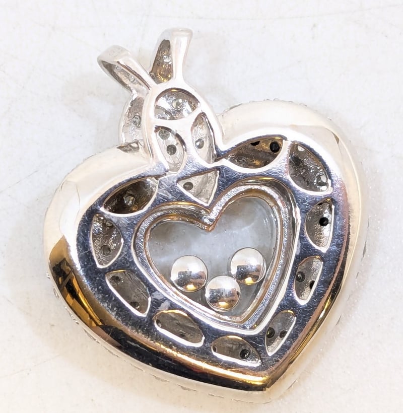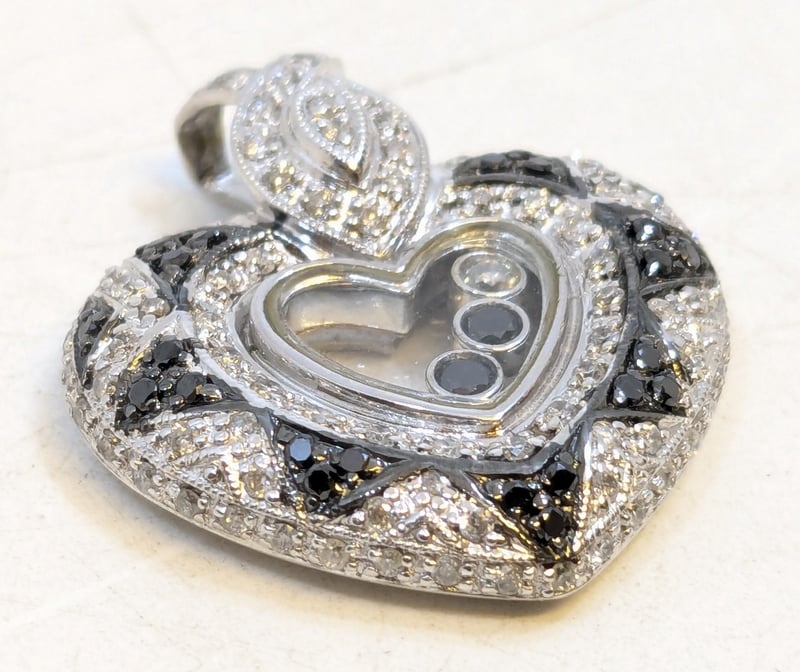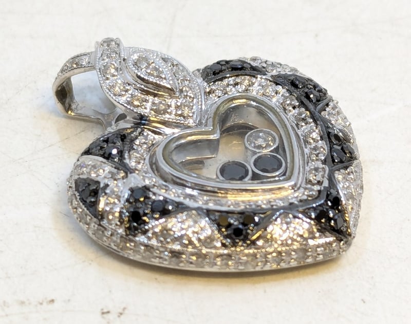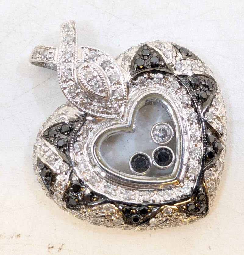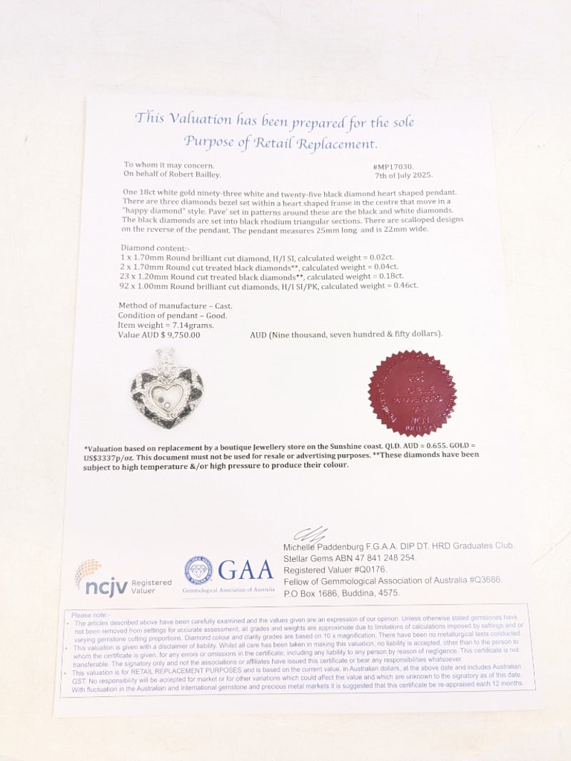 18CT WHITE GOLD HEART SHAPED PENDANTDiamond Content:1 X 1.7Mm Round Brilliant Cut Diamond, H/I Si, Weight = 0.02Ct2 X 1.7Mm Round Cut Treated Black Diamonds, Weight = 0.04Ct23 X 1.2Mm Round Cut Treated Black Diamonds, Weight = 0.18Ct92 X 1Mm Round Brilliant Cut Diamonds, H/I Si/ Pk, Weight = 0.46CtTotal Item Weight: 7.14gCondition: Good - Refer To ImagesThis valuation has been conducted by an independent third-party professional. The valuation amount is an assessment by the issuing valuer and does not reflect the auction value of the item.Any inquiries regarding the valuation should be directed to the issuing valuer (refer to contact details on the certificate), as Lloyds Auctions has no affiliation or influence over the valuation, the valuer, or the stated amount.Insurance Replacement Valuation Amount: $9,750.00585025+42