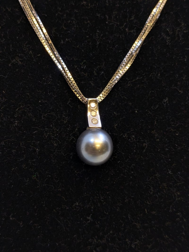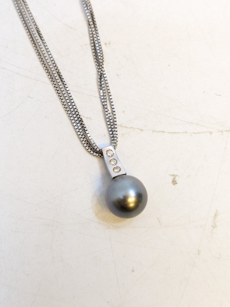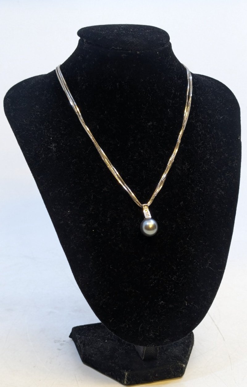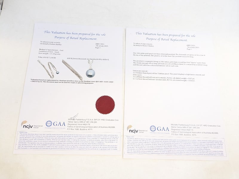 18CT WHITE GOLD PEARL AND THREE DIAMOND PENDANT'Salvini' Neck Chain, Secured With Lobster ClaspGemstone Content:1 X 9.6Mm Round Grey Fine Tahitian Pearl3 X 1.8Mm Round Brilliant Cut Diamonds, H/I Si, Weight = 0.075Ct2 X 1.25Mm Round Brilliant Cut Diamonds, H/I Si, Weight = 0.015CtTotal Item Weight: 12.00gLength: 45.00cmCondition: Good - Refer To ImagesThis valuation has been conducted by an independent third-party professional. The valuation amount is an assessment by the issuing valuer and does not reflect the auction value of the item.Any inquiries regarding the valuation should be directed to the issuing valuer (refer to contact details on the certificate), as Lloyds Auctions has no affiliation or influence over the valuation, the valuer, or the stated amount.Insurance Replacement Valuation Amount: $7,250.00585025+10