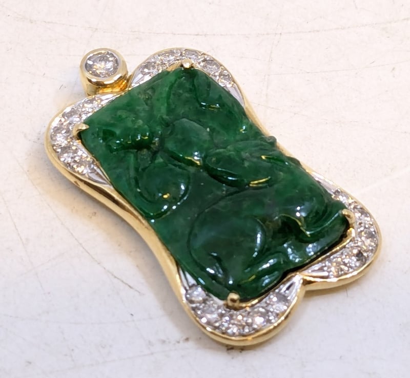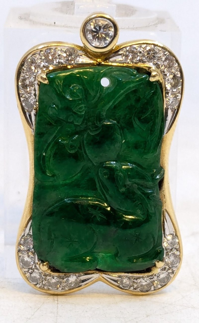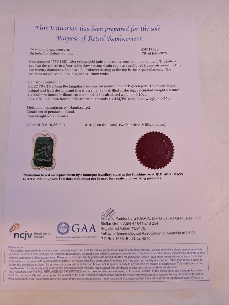 18K YELLOW GOLD JADE PENDANTGemstone Content:1 X 22.7 X 14.5Mm Rectangular Hand Carved Dark Green Jade, Weight = 5Ct1 X 3Mm Round Brilliant Cut Diamond, G Si, Weight = 0.1Ct20 X 1.70 - 2Mm Round Brilliant Cut Diamonds, G/H Si/Pk, Weight = 0.44CtTotal Item Weight: 9.06gMarkings: Stamped '750 18K'Condition: Good - Refer To ImagesThis valuation has been conducted by an independent third-party professional. The valuation amount is an assessment by the issuing valuer and does not reflect the auction value of the item.Any inquiries regarding the valuation should be directed to the issuing valuer (refer to contact details on the certificate), as Lloyds Auctions has no affiliation or influence over the valuation, the valuer, or the stated amount.Insurance Replacement Valuation Amount: $10,250.00585025+27