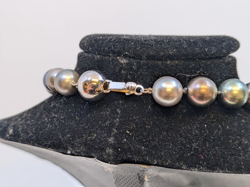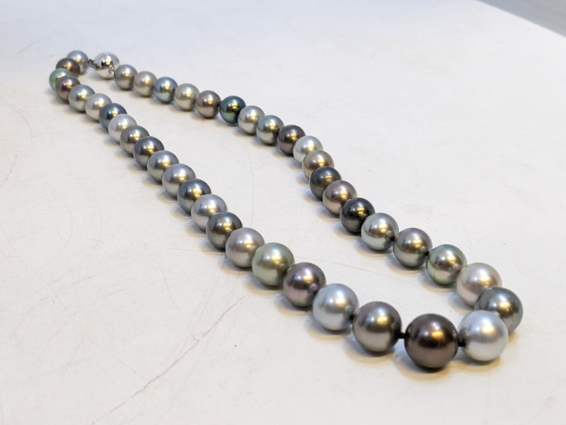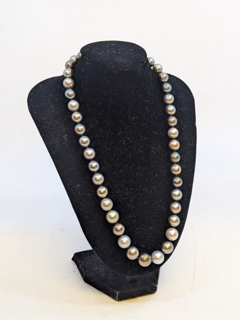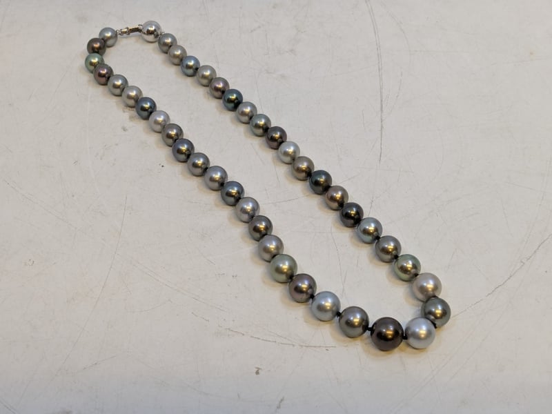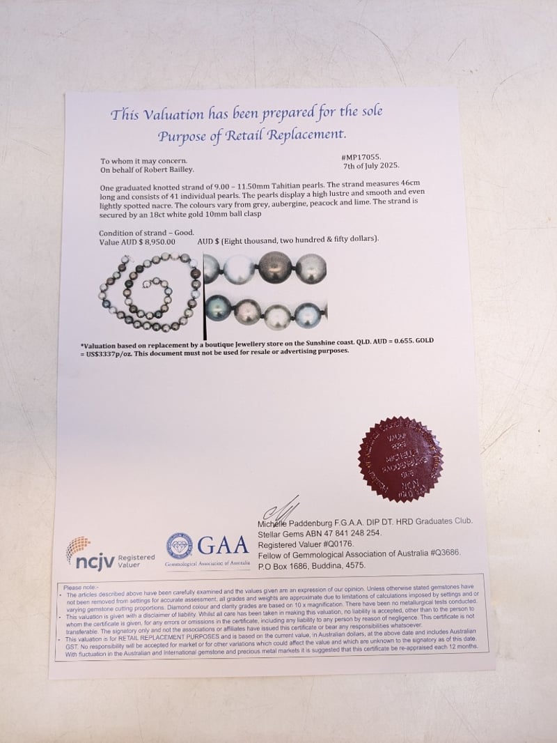 TAHITIAN PEARLS NECKLACEContains 41 Invidividual Pearls, Colours Range From Grey, Aubergine, Lime, Etc. Secured With 18Ct White Gold 10Mm Ball ClaspLength: 46.00cmCondition: Good - Refer To ImagesThis valuation has been conducted by an independent third-party professional. The valuation amount is an assessment by the issuing valuer and does not reflect the auction value of the item.Any inquiries regarding the valuation should be directed to the issuing valuer (refer to contact details on the certificate), as Lloyds Auctions has no affiliation or influence over the valuation, the valuer, or the stated amount.Insurance Replacement Valuation Amount: $8,950.00585025+12