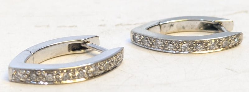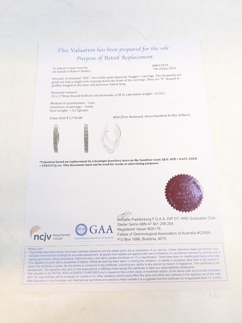 14CT WHITE GOLD DIAMOND 'HUGGIES' EARRINGSTotal Item Weight: 4.17gDimensions: Width: 18.00mmMarkings: Stamped '585'Condition: Good - Refer To ImagesThis valuation has been conducted by an independent third-party professional. The valuation amount is an assessment by the issuing valuer and does not reflect the auction value of the item.Any inquiries regarding the valuation should be directed to the issuing valuer (refer to contact details on the certificate), as Lloyds Auctions has no affiliation or influence over the valuation, the valuer, or the stated amount.Insurance Replacement Valuation Amount: $5,750.00585025+3