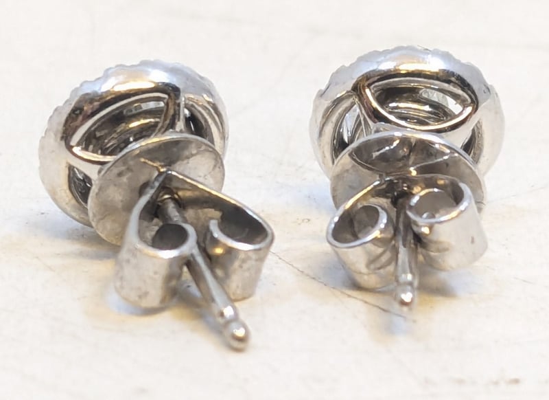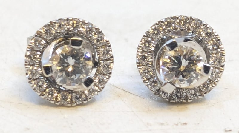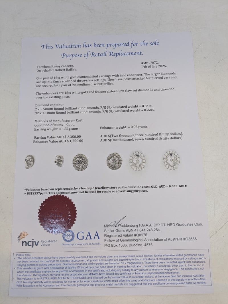 18CT WHITE GOLD DIAMOND STUD EARRINGS WITH HALO ENHANCERSEnhancers: 18Ct White Gold2 X 3.50Mm Round Brilliant Cut Diamonds, F/G Si, Calculated Weight = 0.34Ct32 X 1.10Mm Round Brilliant Cut Diamonds, F/G Si, Calculated Weight = 0.22CtTotal Item Weight: 2.29gCondition: Good - Refer To ImagesThis valuation has been conducted by an independent third-party professional. The valuation amount is an assessment by the issuing valuer and does not reflect the auction value of the item.Any inquiries regarding the valuation should be directed to the issuing valuer (refer to contact details on the certificate), as Lloyds Auctions has no affiliation or influence over the valuation, the valuer, or the stated amount.Insurance Replacement Valuation Amount: $4,100.00585025+2