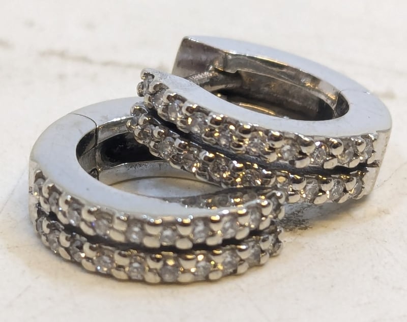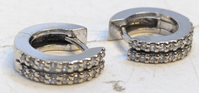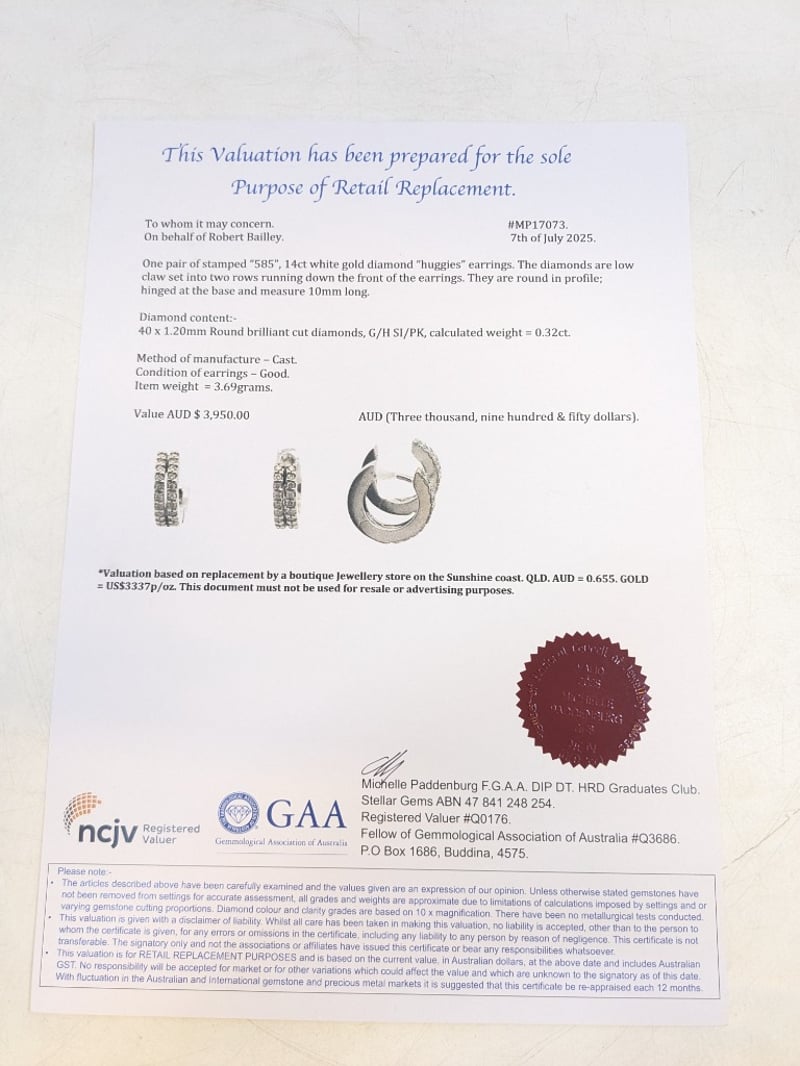 14CT WHITE GOLD DIAMOND 'HUGGIES' EARRINGSDiamond Content: 40 X 1.20Mm Round Brilliant Cut Diamonds, G/H Si/ Pk, Calculated Weight = 0.32CtTotal Item Weight: 3.69gLength: 1.00cmMarkings: Stamped '585'Condition: Good - Refer To ImagesThis valuation has been conducted by an independent third-party professional. The valuation amount is an assessment by the issuing valuer and does not reflect the auction value of the item.Any inquiries regarding the valuation should be directed to the issuing valuer (refer to contact details on the certificate), as Lloyds Auctions has no affiliation or influence over the valuation, the valuer, or the stated amount.Insurance Replacement Valuation Amount: $3,950.00585025+6