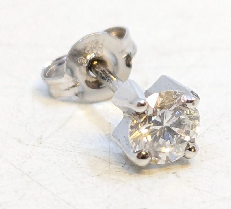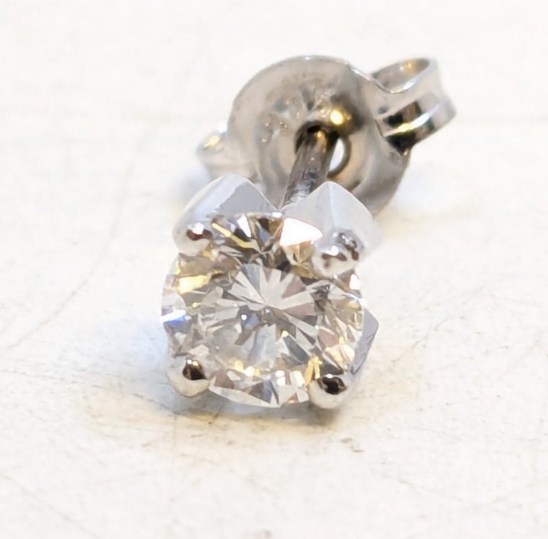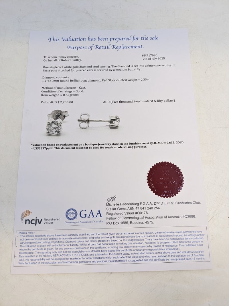 9CT SINGLE WHITE GOLD DIAMOND STUD EARRINGDiamond Content:1 X 4.4Mm Round Brilliant Cut Diamond, F/G Si, Weight = 0.35CtTotal Item Weight: 0.62gCondition: Good - Refer To ImagesThis valuation has been conducted by an independent third-party professional. The valuation amount is an assessment by the issuing valuer and does not reflect the auction value of the item.Any inquiries regarding the valuation should be directed to the issuing valuer (refer to contact details on the certificate), as Lloyds Auctions has no affiliation or influence over the valuation, the valuer, or the stated amount.Insurance Replacement Valuation Amount: $2,250.00585025+55