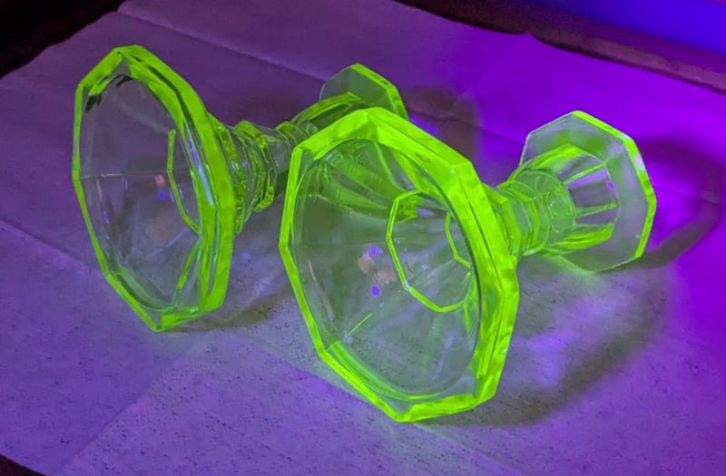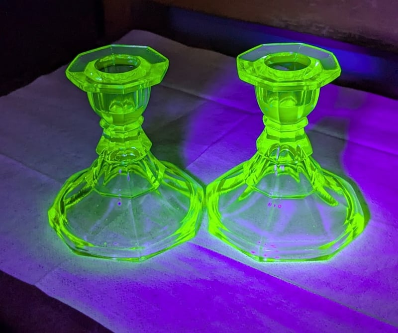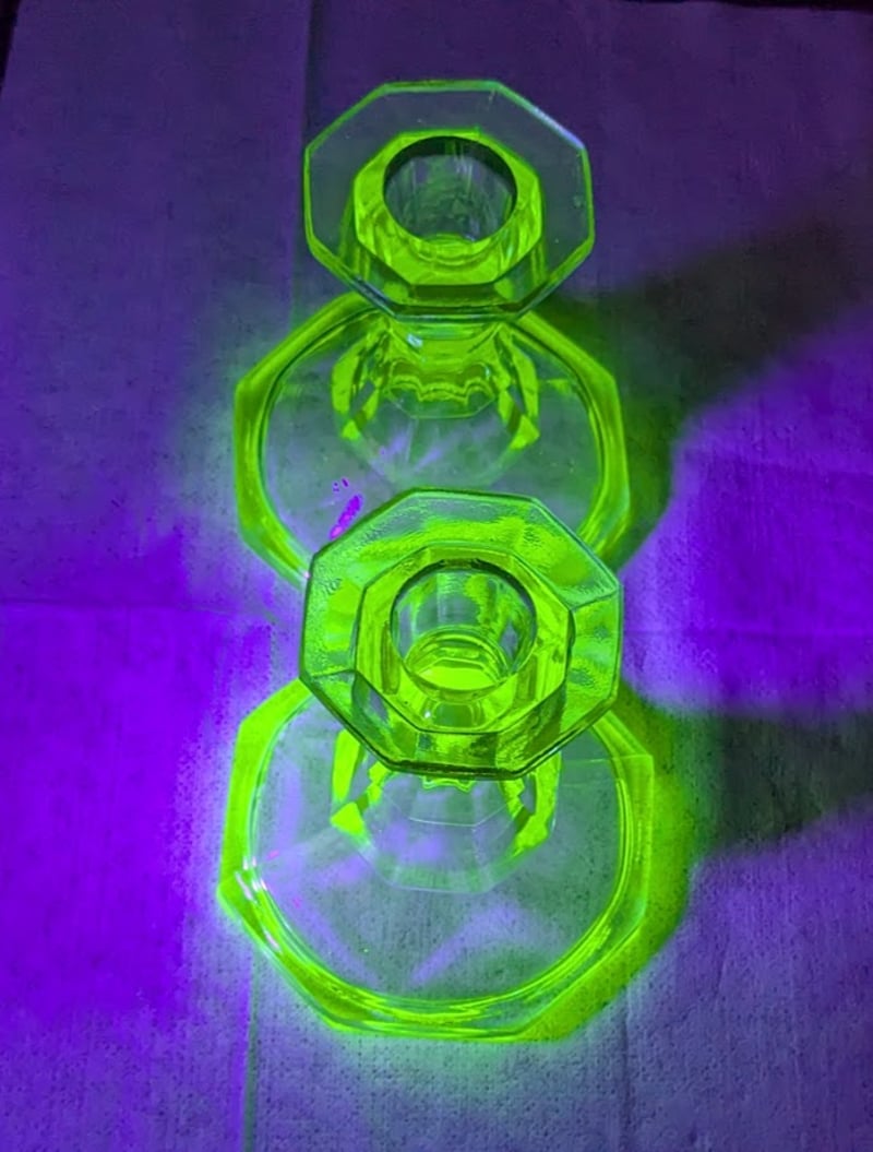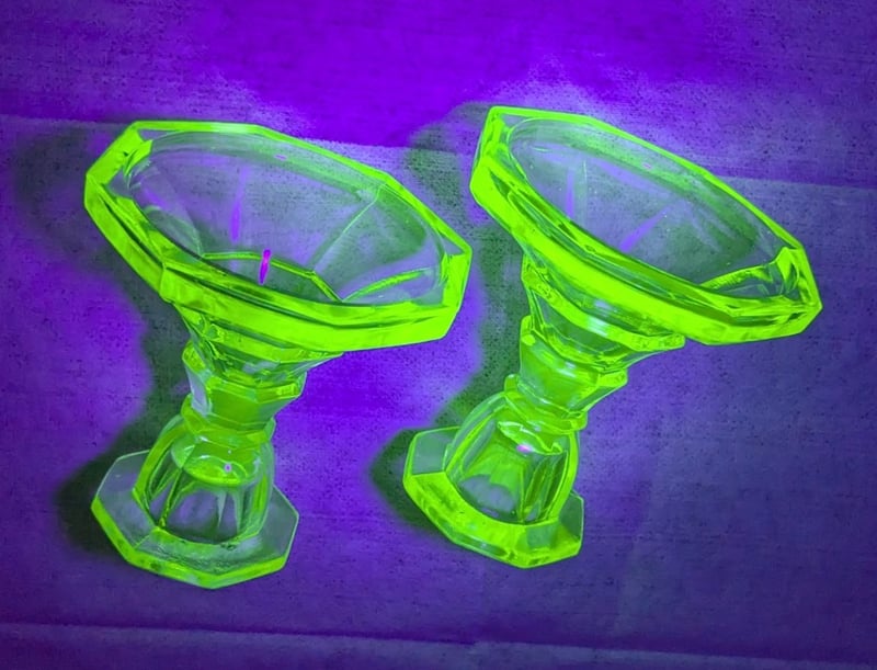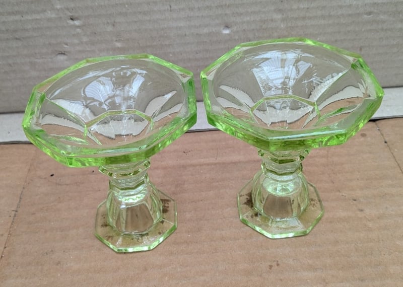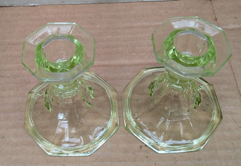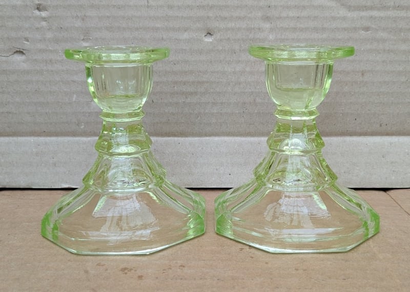 VINTAGE URANIUM DEPRESSION GLASS CANDLE HOLDERItem Size: Height: 8cm, Width: 8cm, Depth: 10cm, Weight: 0.5Kg9.5Cm Tall - Qty 2Condition: Good - Refer To Images10B586252+3