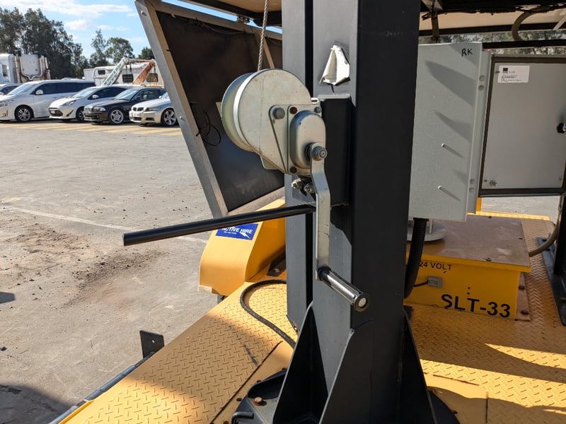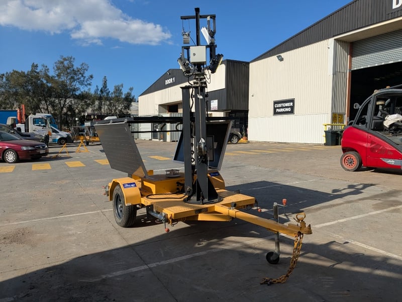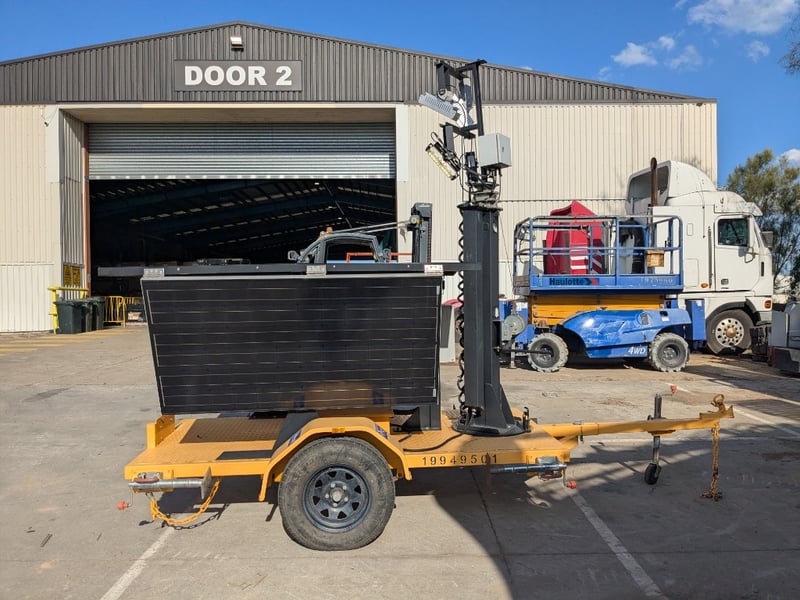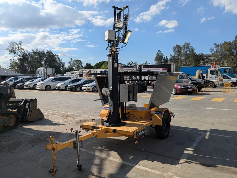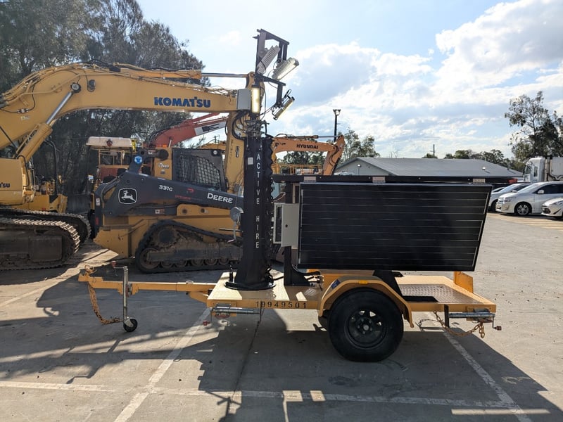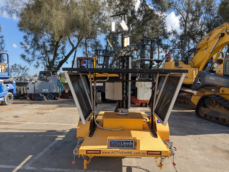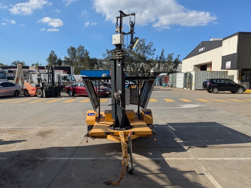 Description: Jockey Wheel, stabilising legs, telescopic light tower, 4 light sections, fuse box, All lights appear to be in working order, light tower height from ground up 7.1mts approximately, trailer length 3mts, 1.3mts wide approximately