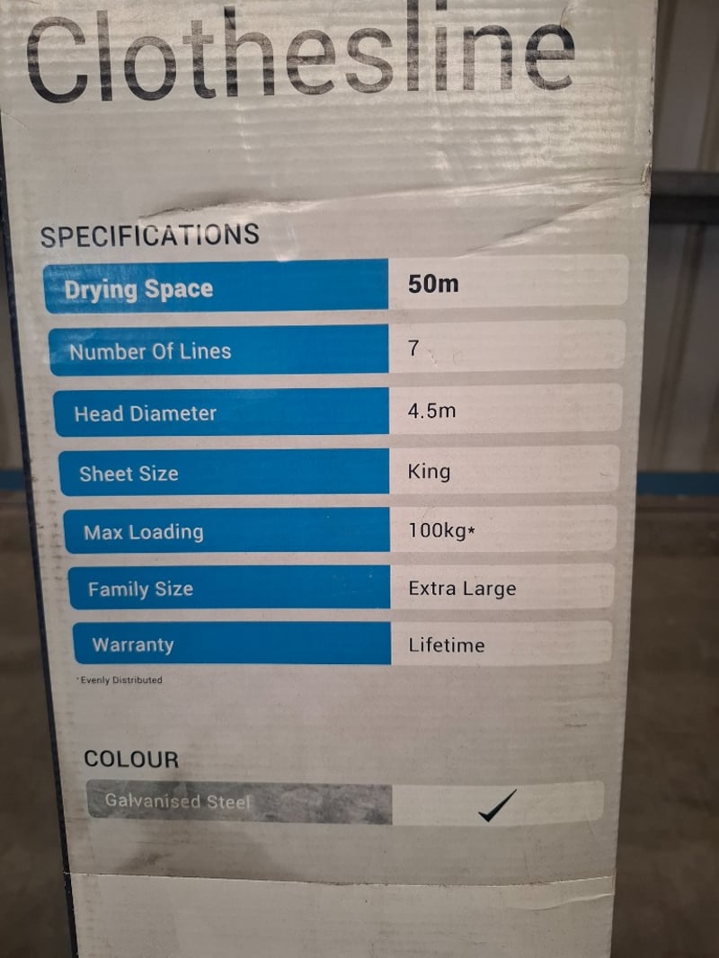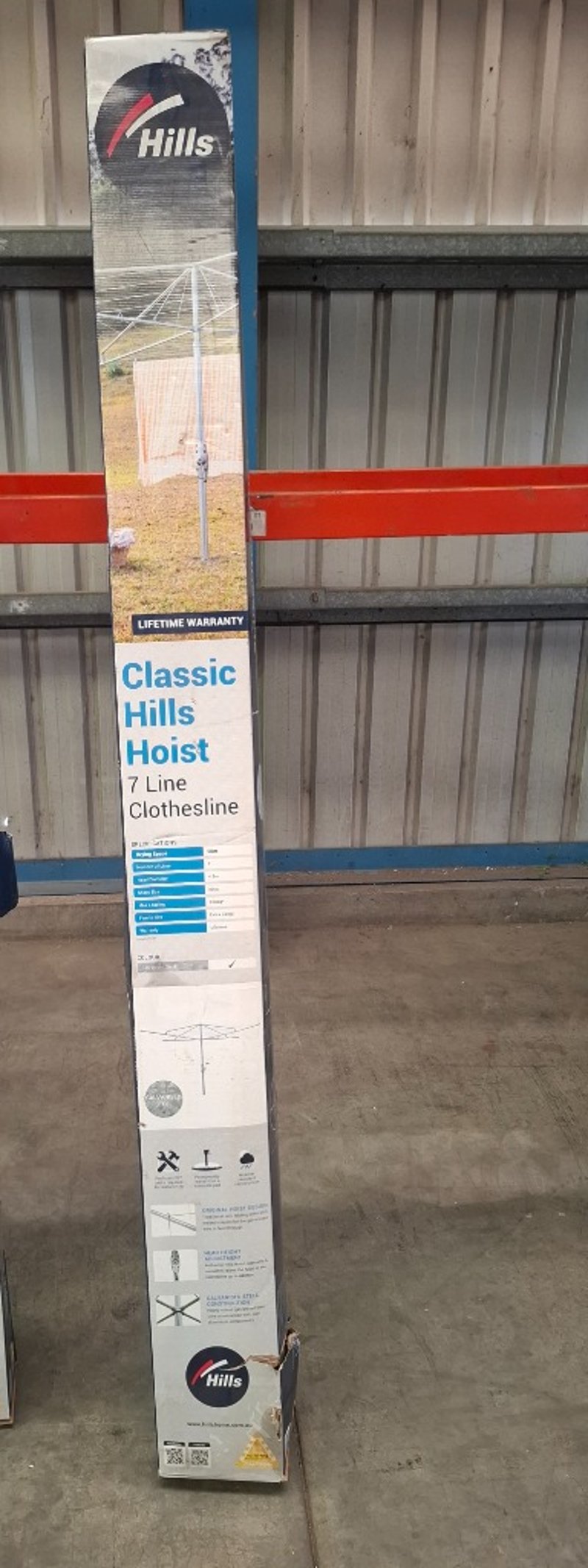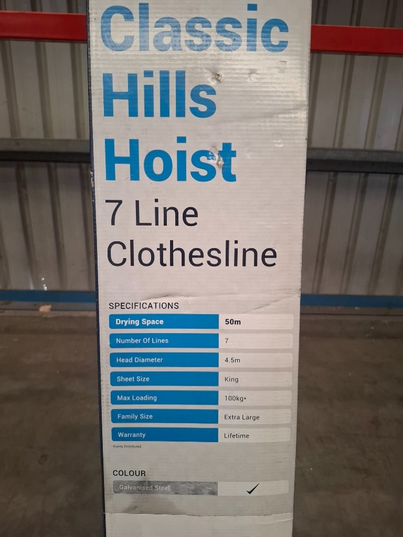 Classic Hills Hoist 7 line clothesline in galvanised steel. Head dia 450cmMax loading 100 KgsBox Dimensions: 228cm (H) X 21cm (W) X 15cm (D)Note: Box has damage. Inspection Recommended