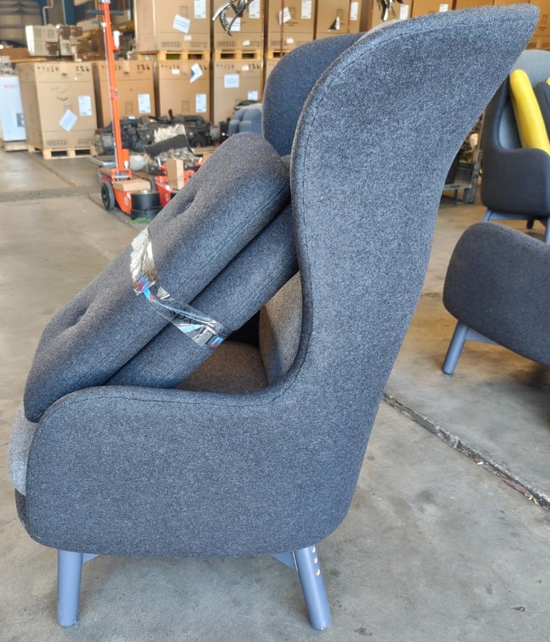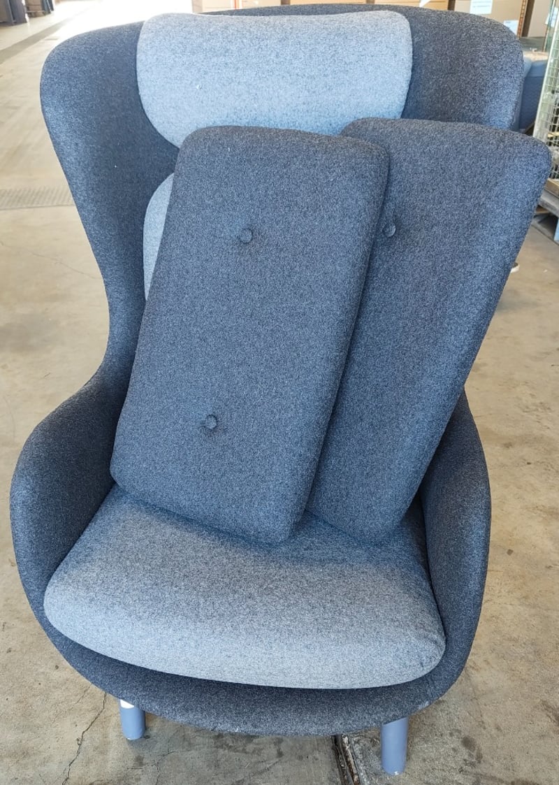 Lounge chair, dark grey fabric, light grey cushion , includes 2 extra dark grey fabric cushion Dimensions: 70cm(W) x 80cm(D) x 110cm(H) Note: Cleaning required, wear and tear