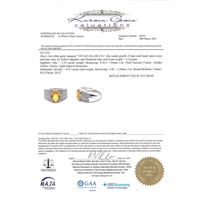 14K WHITE GOLD, YELLOW SAPPHIRE AND DIAMOND, TRIPLE ROW DRESS RING. The Centre Features, One Oval Faceted Cut, Light Fancy Yellow, Diamond (0.46Ct, Si1-Si2 Clarity), 4 Claw Set. Flanking The Centre Are, 2 Pear Brilliant Cut, Light Fancy Yellow, Diamonds (0.40Ct Tdw, Si1-Si2 Clarity), 3 Claw Set In Yellow Gold. Decorating The Band Are, 12 Round Brilliant Cut, Diamonds (0.10Ct Tdw, G-H Colour, Si1-Si2 Clarity), Bead Set In White Gold. Ring Size N 1/2. Valuations Provided by an Independent Third-Party Professional Not Directly Associated With Lloyds Auctions at AUD $$12,200.00This valuation has been conducted by an independent third-party professional. The valuation amount is an assessment by the issuing valuer and does not reflect the auction value of the item. Any inquiries regarding the valuation should be directed to the issuing valuer (refer to contact details on the certificate), as Lloyds Auctions has no affiliation or influence over the valuation, the valuer, or the stated amount. Condition: Good - Refer Images 0+54