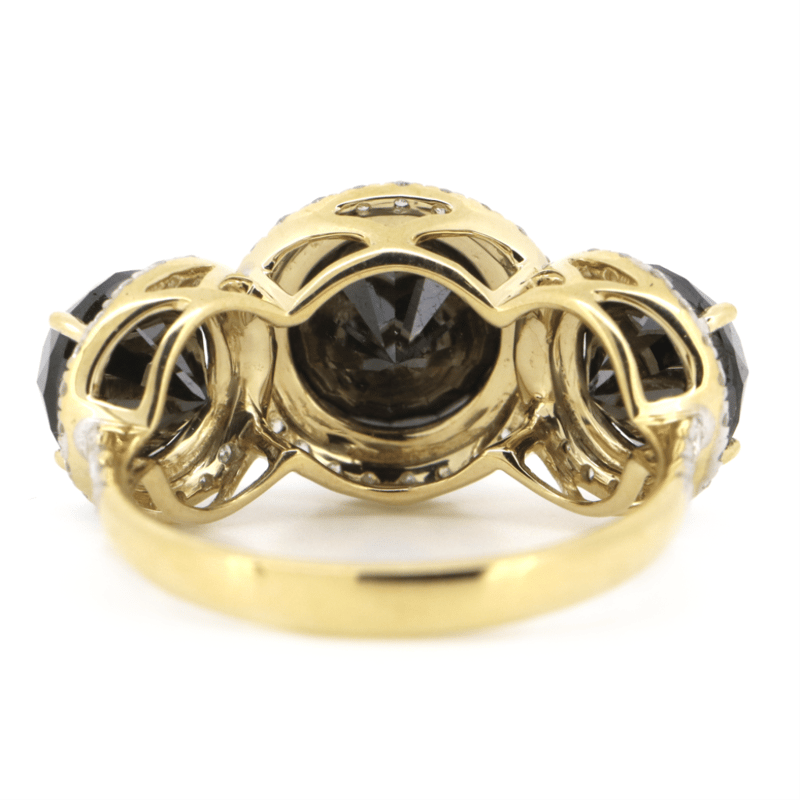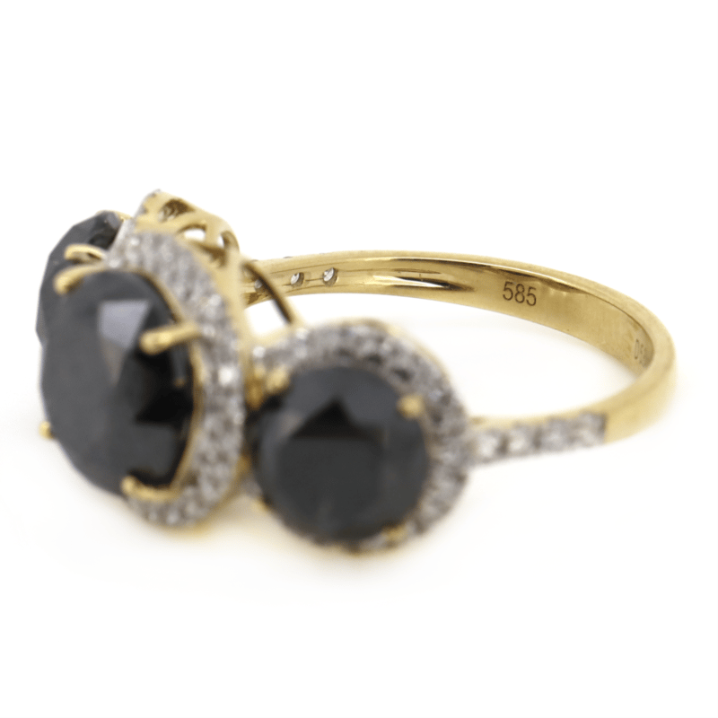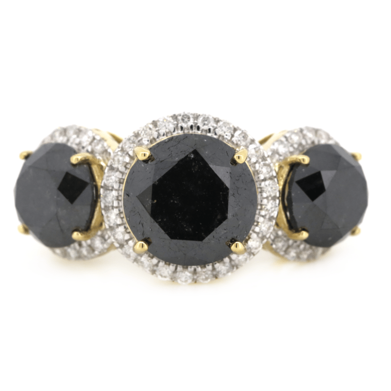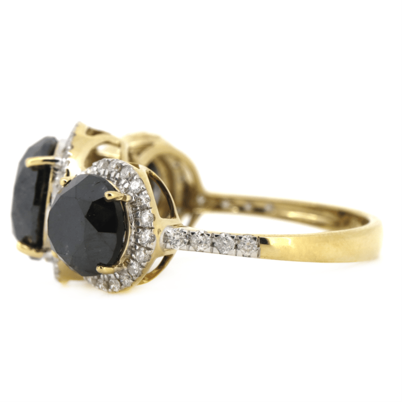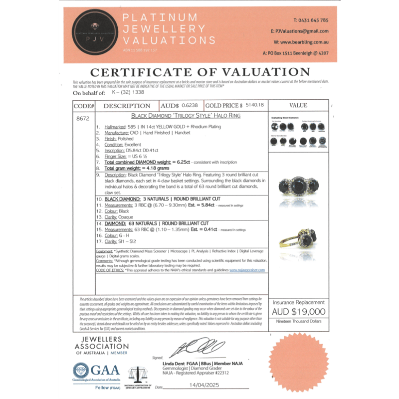 14K YELLOW GOLD, BLACK DIAMOND AND DIAMOND, TRILOGY HALO RING. The Centre Features, One Oval Faceted Cut, Light Fancy Yellow, Diamond (0.46Ct, Si1-Si2 Clarity), 4 Claw Set. Flanking The Centre Are, 2 Pear Brilliant Cut, Light Fancy Yellow, Diamonds (0.40Ct Tdw, Si1-Si2 Clarity), 3 Claw Set In Yellow Gold. Decorating The Band Are, 12 Round Brilliant Cut, Diamonds (0.10Ct Tdw, G-H Colour, Si1-Si2 Clarity), Bead Set In White Gold. Ring Size N 1/2. Valuations Provided by an Independent Third-Party Professional Not Directly Associated With Lloyds Auctions at AUD $$19,000.00This valuation has been conducted by an independent third-party professional. The valuation amount is an assessment by the issuing valuer and does not reflect the auction value of the item. Any inquiries regarding the valuation should be directed to the issuing valuer (refer to contact details on the certificate), as Lloyds Auctions has no affiliation or influence over the valuation, the valuer, or the stated amount. Condition: Good - Refer Images 0+69