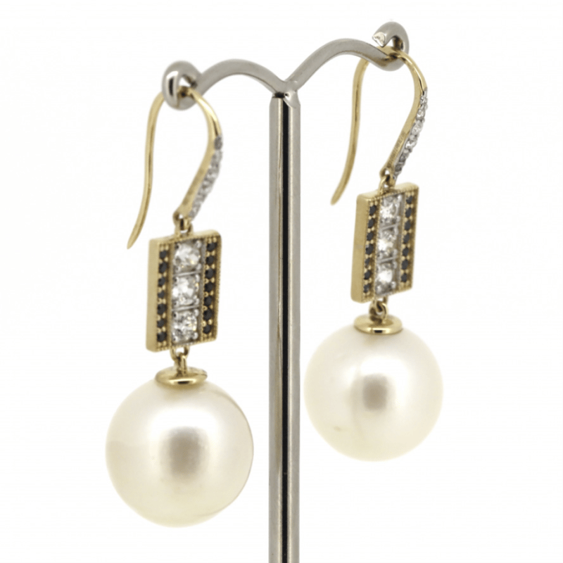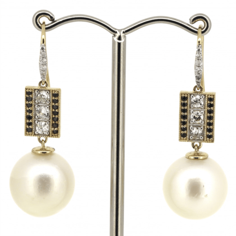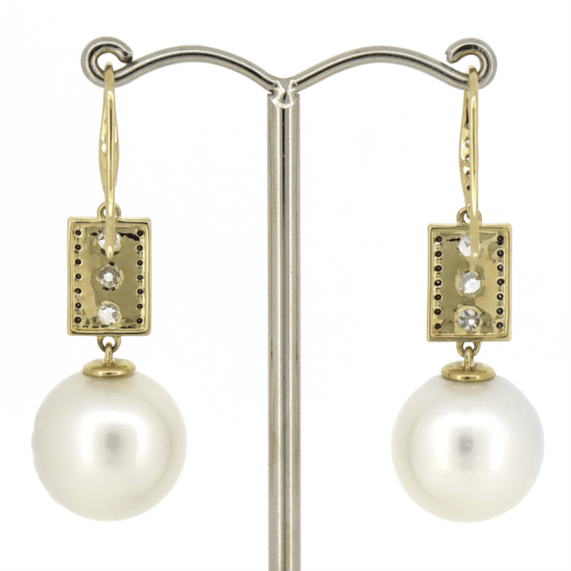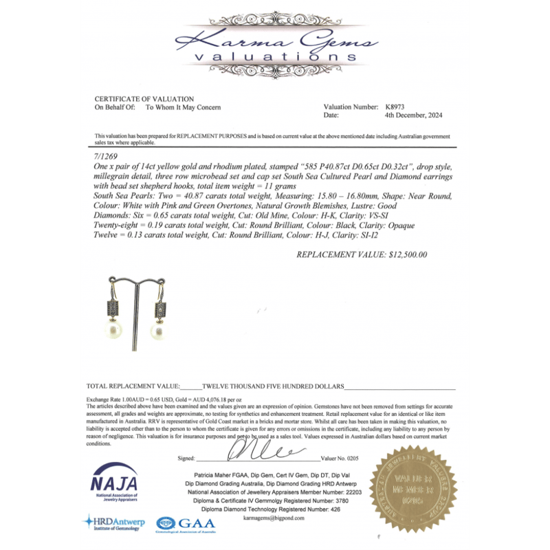 14K YELLOW GOLD, WHITE CULTURED SOUTH SEA PEARL AND DIAMOND, DROP EARRINGS. The Centre Features, One Oval Faceted Cut, Light Fancy Yellow, Diamond (0.46Ct, Si1-Si2 Clarity), 4 Claw Set. Flanking The Centre Are, 2 Pear Brilliant Cut, Light Fancy Yellow, Diamonds (0.40Ct Tdw, Si1-Si2 Clarity), 3 Claw Set In Yellow Gold. Decorating The Band Are, 12 Round Brilliant Cut, Diamonds (0.10Ct Tdw, G-H Colour, Si1-Si2 Clarity), Bead Set In White Gold. Ring Size N 1/2. Valuations Provided by an Independent Third-Party Professional Not Directly Associated With Lloyds Auctions at AUD $$12,500.00This valuation has been conducted by an independent third-party professional. The valuation amount is an assessment by the issuing valuer and does not reflect the auction value of the item. Any inquiries regarding the valuation should be directed to the issuing valuer (refer to contact details on the certificate), as Lloyds Auctions has no affiliation or influence over the valuation, the valuer, or the stated amount. Condition: Good - Refer Images 0+93