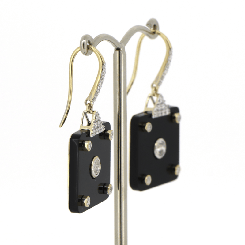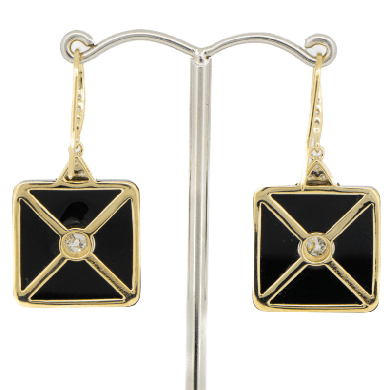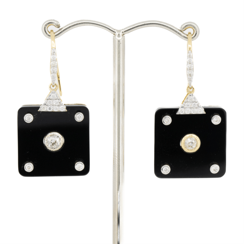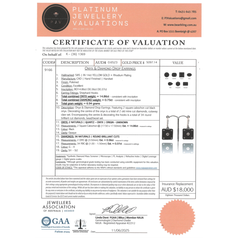 14K YELLOW GOLD, BLACK ONYX AND DIAMOND, DROP EARRINGS. The Centre Features, One Oval Faceted Cut, Light Fancy Yellow, Diamond (0.46Ct, Si1-Si2 Clarity), 4 Claw Set. Flanking The Centre Are, 2 Pear Brilliant Cut, Light Fancy Yellow, Diamonds (0.40Ct Tdw, Si1-Si2 Clarity), 3 Claw Set In Yellow Gold. Decorating The Band Are, 12 Round Brilliant Cut, Diamonds (0.10Ct Tdw, G-H Colour, Si1-Si2 Clarity), Bead Set In White Gold. Ring Size N 1/2. Valuations Provided by an Independent Third-Party Professional Not Directly Associated With Lloyds Auctions at AUD $$18,000.00This valuation has been conducted by an independent third-party professional. The valuation amount is an assessment by the issuing valuer and does not reflect the auction value of the item. Any inquiries regarding the valuation should be directed to the issuing valuer (refer to contact details on the certificate), as Lloyds Auctions has no affiliation or influence over the valuation, the valuer, or the stated amount. Condition: Good - Refer Images 0+100