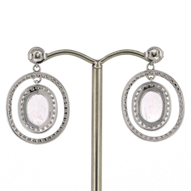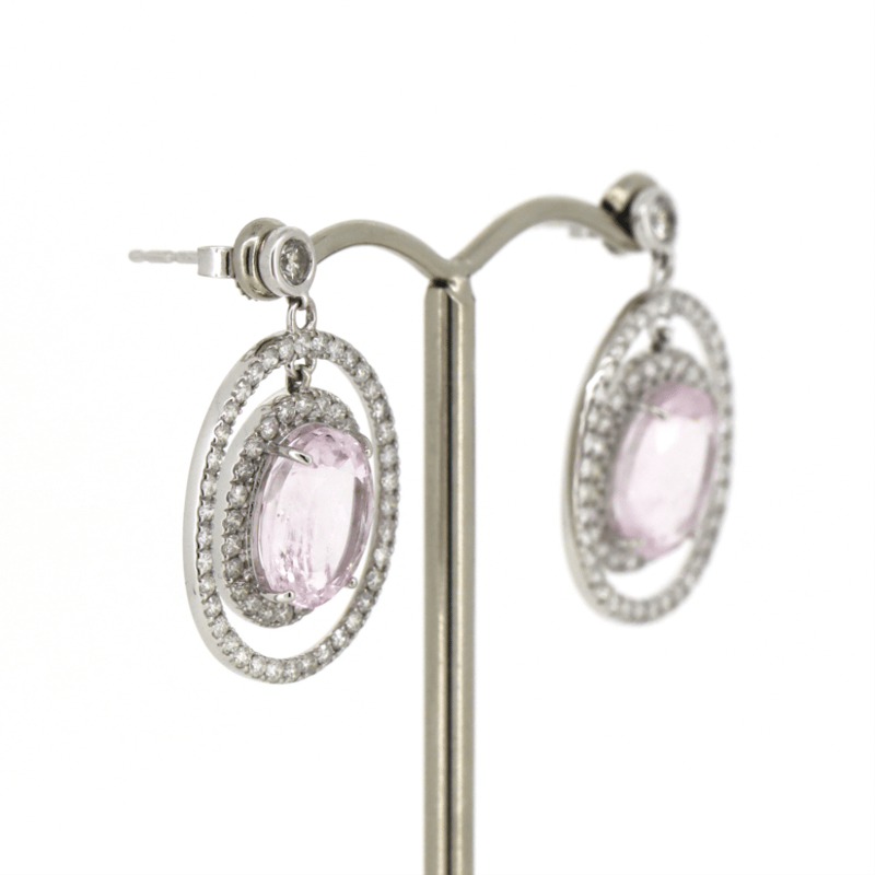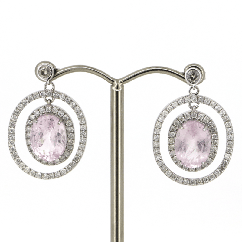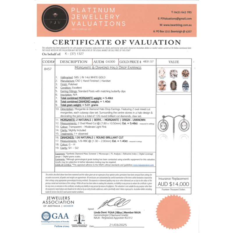 14K WHITE GOLD, MORGANITE AND DIAMOND, HALO DROP EARRINGS. The Centre Features, One Oval Faceted Cut, Light Fancy Yellow, Diamond (0.46Ct, Si1-Si2 Clarity), 4 Claw Set. Flanking The Centre Are, 2 Pear Brilliant Cut, Light Fancy Yellow, Diamonds (0.40Ct Tdw, Si1-Si2 Clarity), 3 Claw Set In Yellow Gold. Decorating The Band Are, 12 Round Brilliant Cut, Diamonds (0.10Ct Tdw, G-H Colour, Si1-Si2 Clarity), Bead Set In White Gold. Ring Size N 1/2. Valuations Provided by an Independent Third-Party Professional Not Directly Associated With Lloyds Auctions at AUD $$14,000.00This valuation has been conducted by an independent third-party professional. The valuation amount is an assessment by the issuing valuer and does not reflect the auction value of the item. Any inquiries regarding the valuation should be directed to the issuing valuer (refer to contact details on the certificate), as Lloyds Auctions has no affiliation or influence over the valuation, the valuer, or the stated amount. Condition: Good - Refer Images 0+70