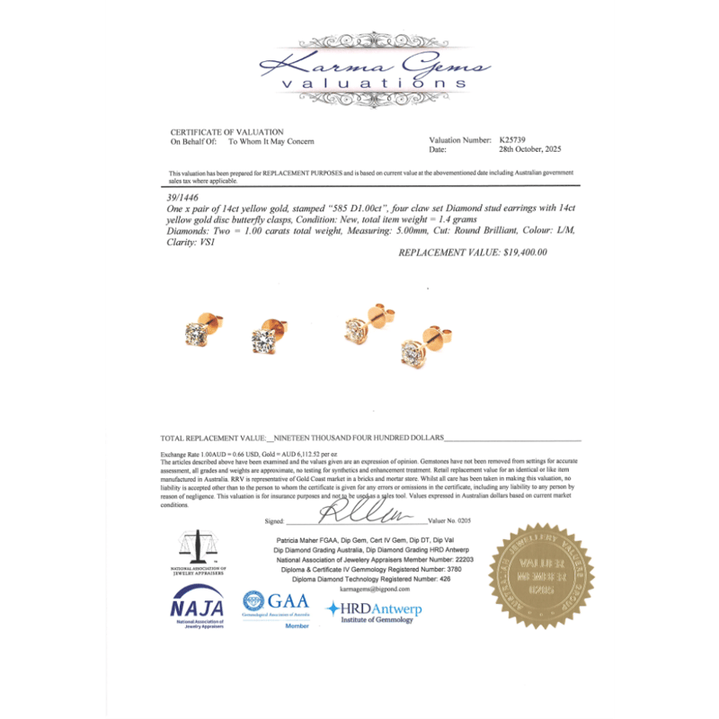 14K YELLOW GOLD, 1.00CT TDW DIAMOND, SOLITAIRE STUD EARRINGS. The Centre Features, One Oval Faceted Cut, Light Fancy Yellow, Diamond (0.46Ct, Si1-Si2 Clarity), 4 Claw Set. Flanking The Centre Are, 2 Pear Brilliant Cut, Light Fancy Yellow, Diamonds (0.40Ct Tdw, Si1-Si2 Clarity), 3 Claw Set In Yellow Gold. Decorating The Band Are, 12 Round Brilliant Cut, Diamonds (0.10Ct Tdw, G-H Colour, Si1-Si2 Clarity), Bead Set In White Gold. Ring Size N 1/2. Valuations Provided by an Independent Third-Party Professional Not Directly Associated With Lloyds Auctions at AUD $$19,400.00This valuation has been conducted by an independent third-party professional. The valuation amount is an assessment by the issuing valuer and does not reflect the auction value of the item. Any inquiries regarding the valuation should be directed to the issuing valuer (refer to contact details on the certificate), as Lloyds Auctions has no affiliation or influence over the valuation, the valuer, or the stated amount. Condition: Good - Refer Images 0+57