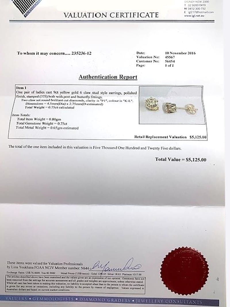 9CT YELLOW GOLD NATURAL DIAMOND 6 CLAW STUDS 2=0.75Cts Kl P1 Valuations Provided by an Independent Third-Party Professional Not Directly Associated With Lloyds Auctions at AUD $5125This valuation has been conducted by an independent third-party professional. The valuation amount is an assessment by the issuing valuer and does not reflect the auction value of the item. Any inquiries regarding the valuation should be directed to the issuing valuer (refer to contact details on the certificate), as Lloyds Auctions has no affiliation or influence over the valuation, the valuer, or the stated amount. Condition: Good - Refer Images 0488388+2