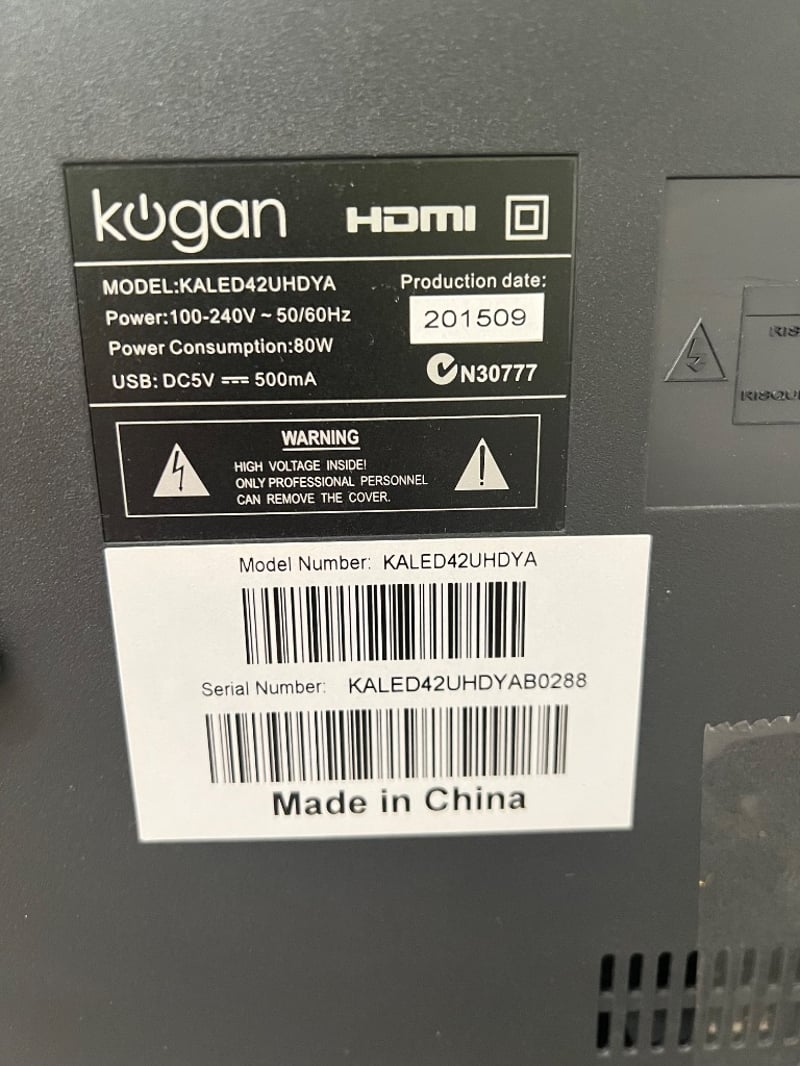 Television, Kogan, Model; KALED42UHDYA, Serial; KALED42UHDYAB0288, 42” screen Quantity; 1