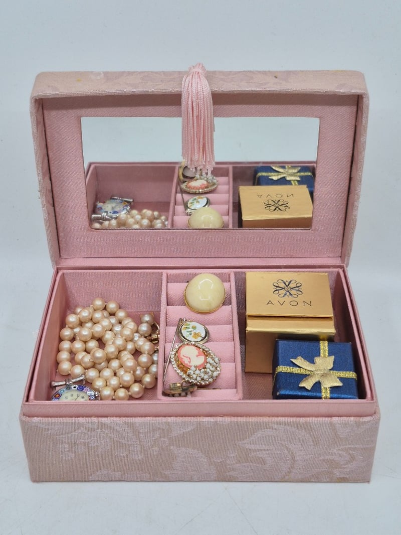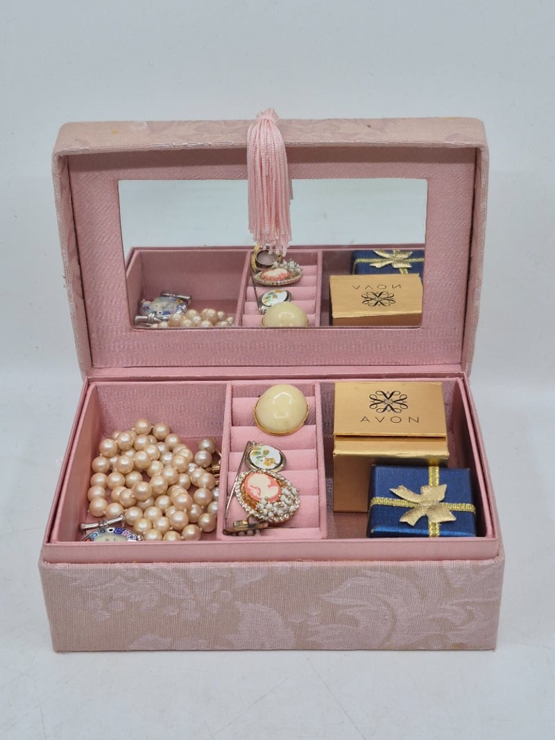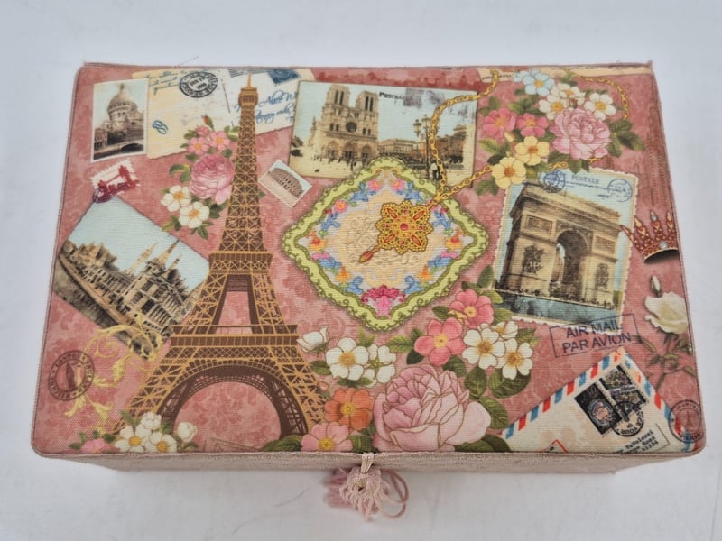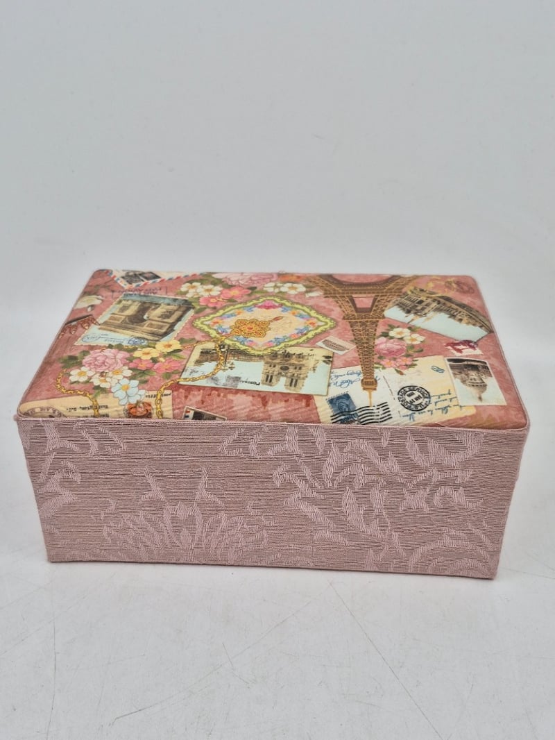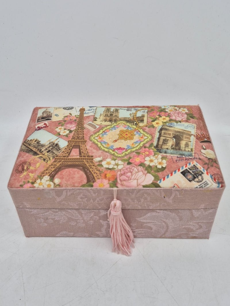 VINTAGE PINK FABRIC JEWELLERY BOX WITH EARRINGS, BROOCH, NECKLACE AND MOREItem Size: Height: 12cm, Width: 18cm, Depth: 17.5cm, Weight: 0.7KgElegant Vintage Jewellery Box Featuring Pink Textured Fabric Exterior With Parisian-Themed Decorative Lid Depicting Eiffel Tower, Flowers And Postcards. Interior Comprises Multiple Compartments With Pink Silk Lining. Contents Include Cream Faux Pearl Beaded Necklace (Approximately 60 Beads), Decorative Ornamental Rings With Floral And Gemstone Details, Silver-Toned Opal Drop Earrings, Cream Ceramic Spherical Item, Decorative Tassel Closure, Blue Fabric-Covered Jewellery Boxes With Gold SnowflakeCondition: Good - Refer To Images9A586265+4