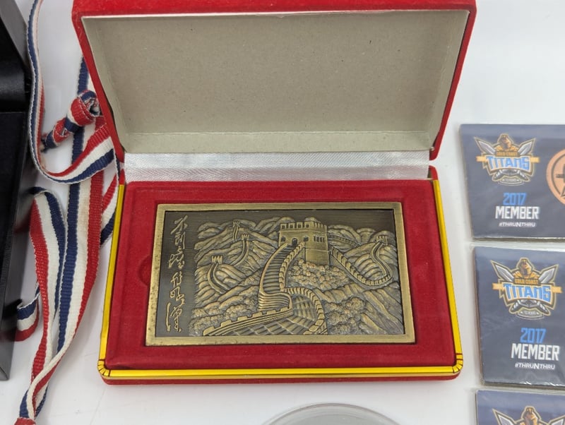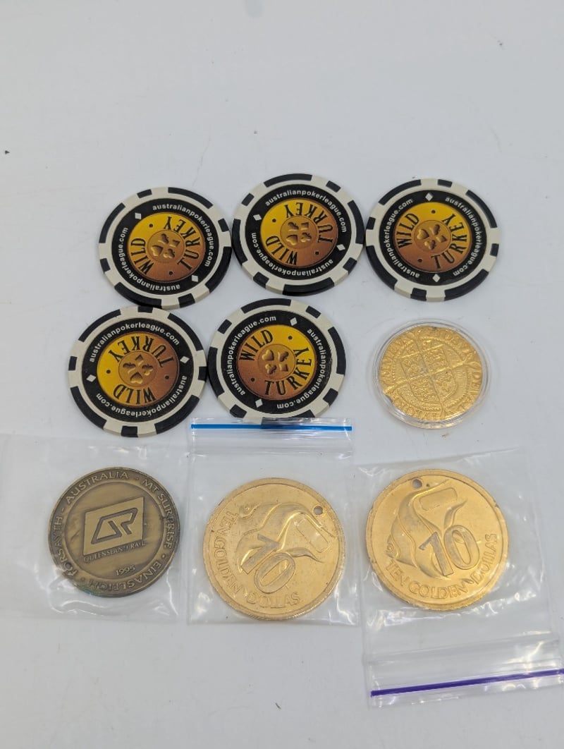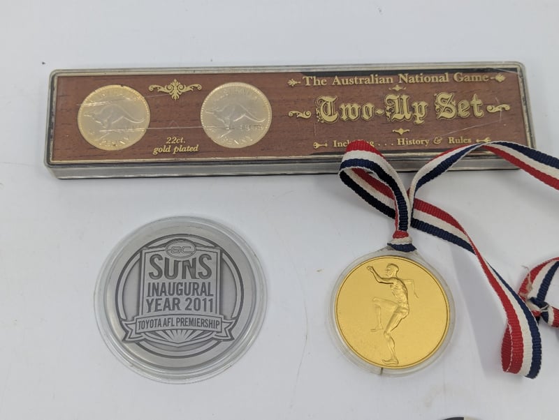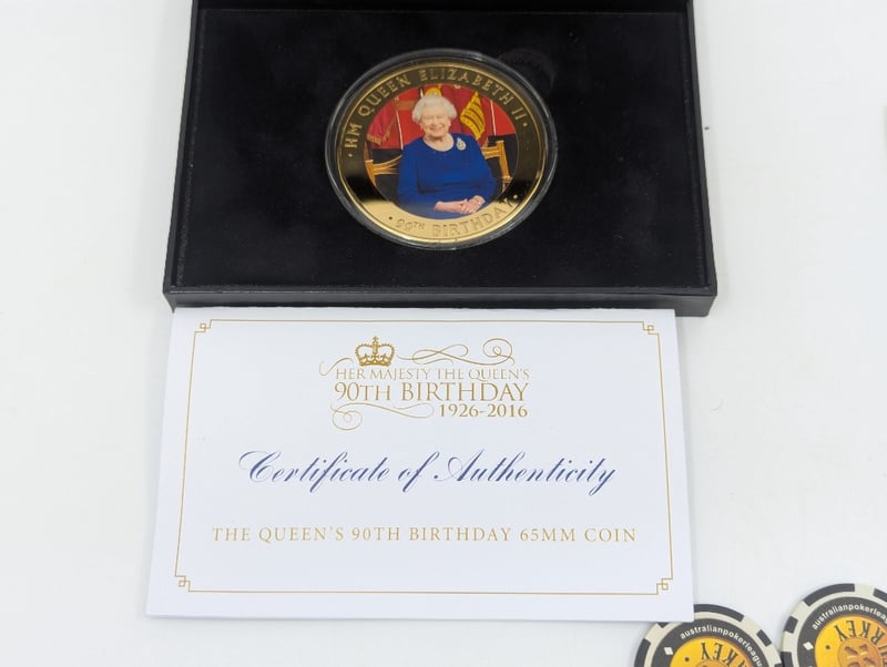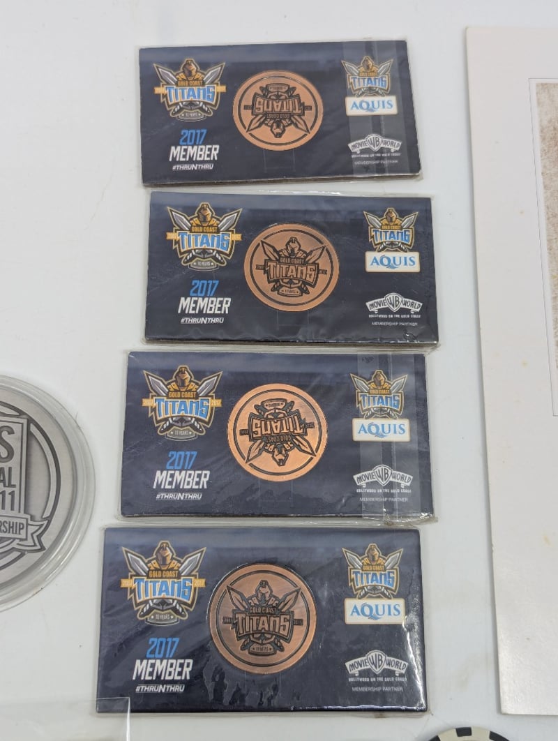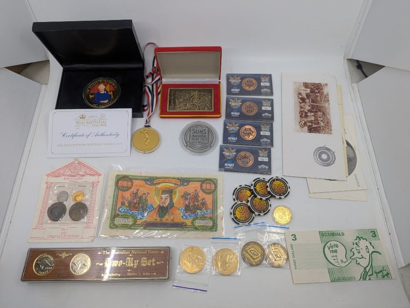 COLLECTION OF COMMEMORATIVE TOKENS/COINS, STAMPS AND FAUX BANKNOTESItems Include Four Gold Coast Titans Tokens, Queen Elizabeth Ii 90Th Birthday Coin With Certificate Of Authenticity, Roman Coin Commemorative Set, Gold Coast Suns Year 2011 Medallion, Hells Faux Banknotes, Etc11B587731+2