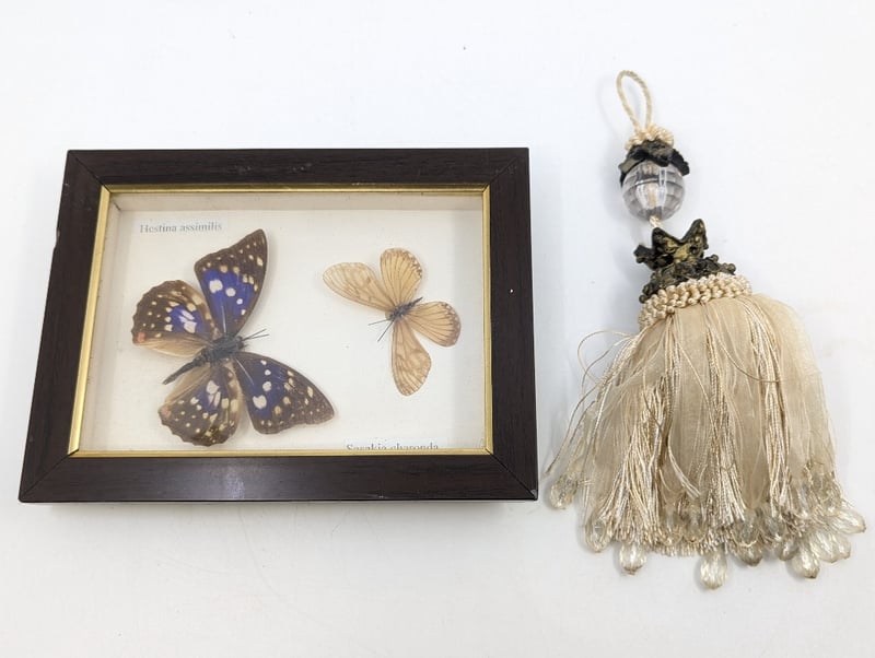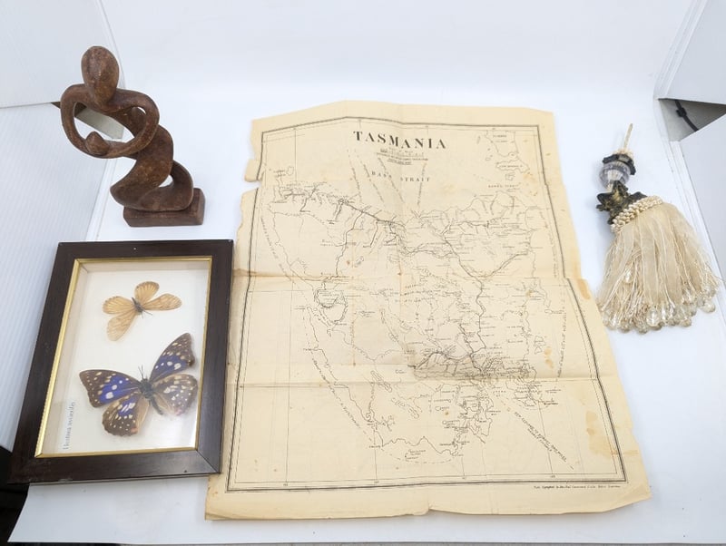 COLLECTION OF HOMEWARE DECORATIVE ITEMS AND TASMANIA PAPER MAPItems Include Timber Statue (Height: 19Cm), Dual Butterfly Display In Frame, Island Girl Style Hanging Decoration11B587731+4