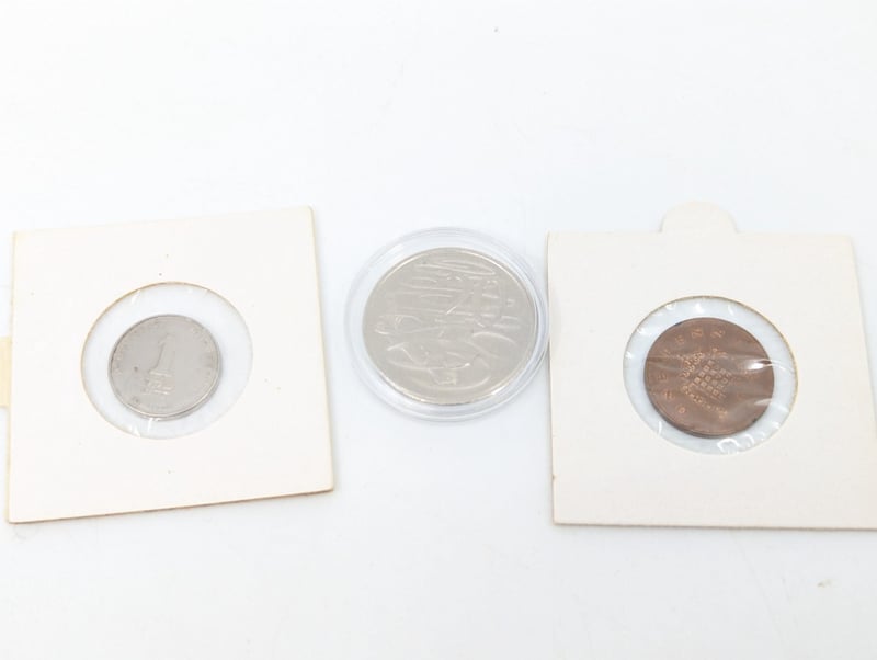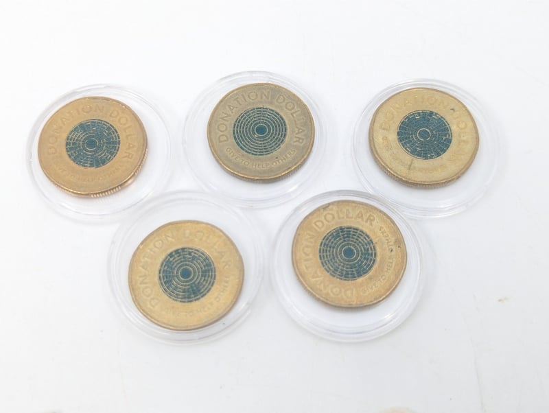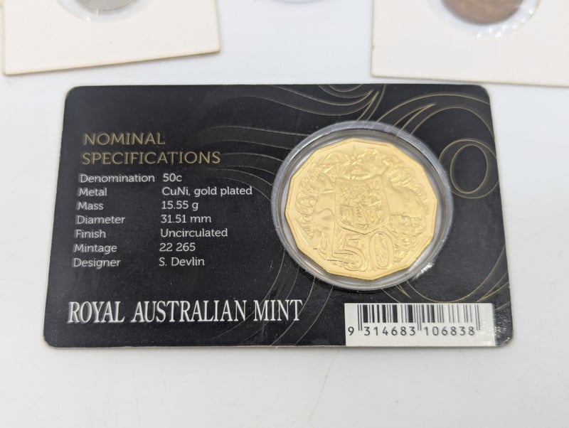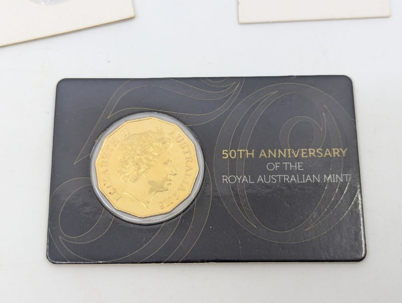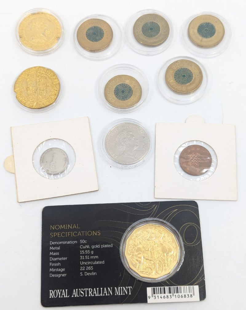 COLLECTION OF WORLD COINS INCLUDING AUSTRALIAN DONATION DOLLARS, 50TH ANNIVERSARY OF THE ROYAL AUSTRALIAN MINT GOLD PLATED FIFTY CENT, ETCIncludes Two Faux Gold Coins11B587731+6