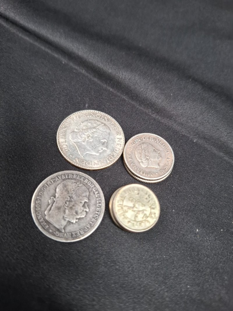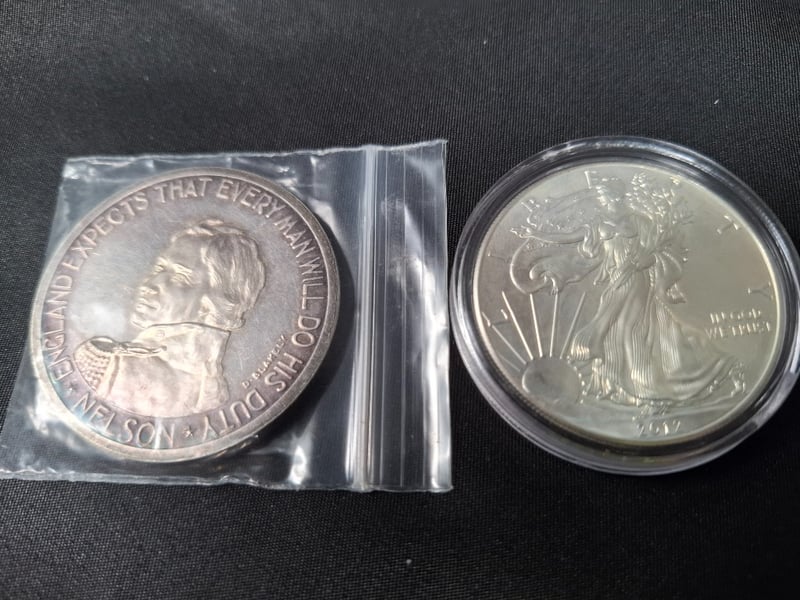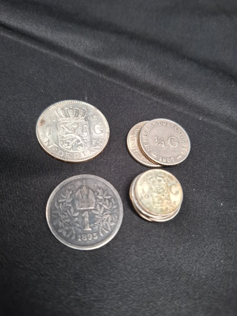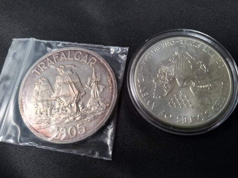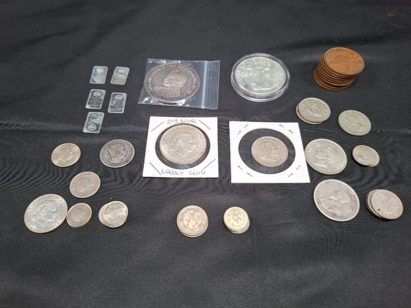 COLLECTION OF SILVER AND COINSIncludes 1 Gr 9995 Gold Germania Mint Bar, 1967 Trafalgar Medallion (40 Gr, 72% Pure Silver), Two 1/2 Gulden Coin, Various 1900'S Dutch, World Coins Ranging From 50% To 92.5% Silver, Etc.Condition: Good585030+2