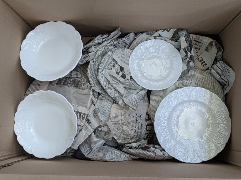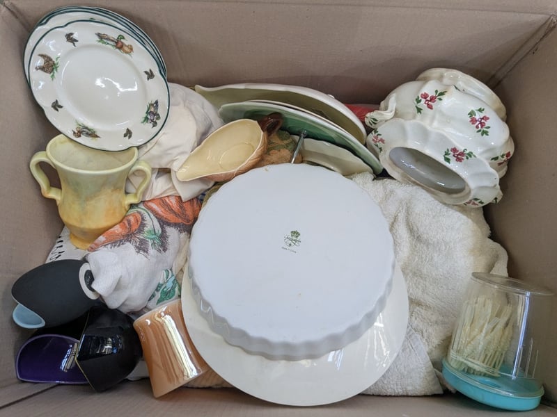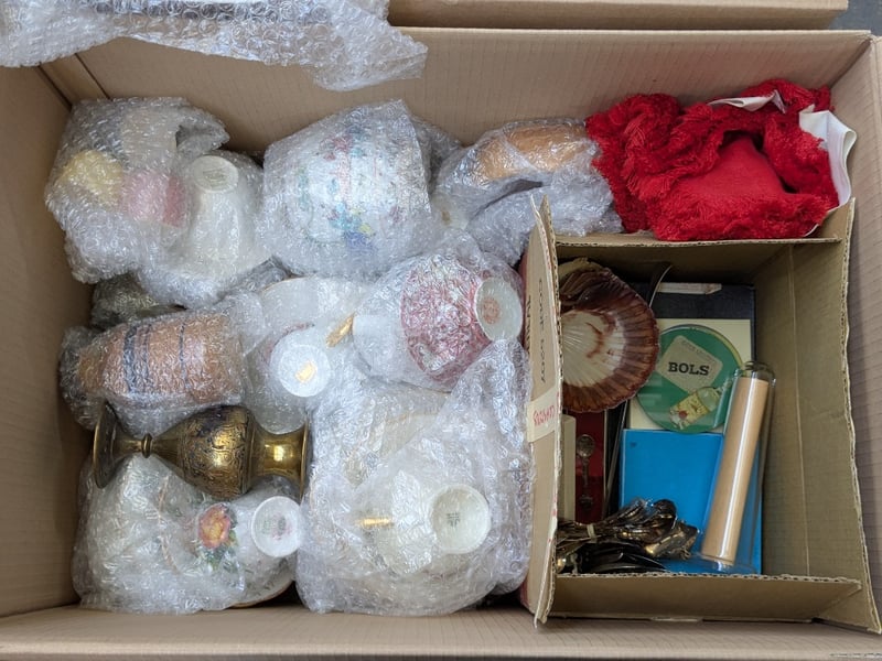 Homewares, 4 boxes includes teacup sets, cutlery, serving dishes and more Sold as lot