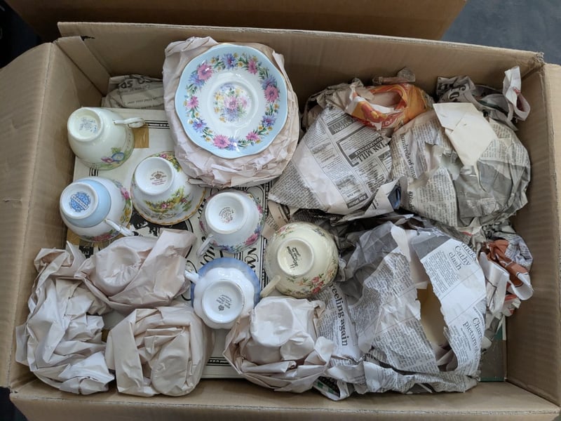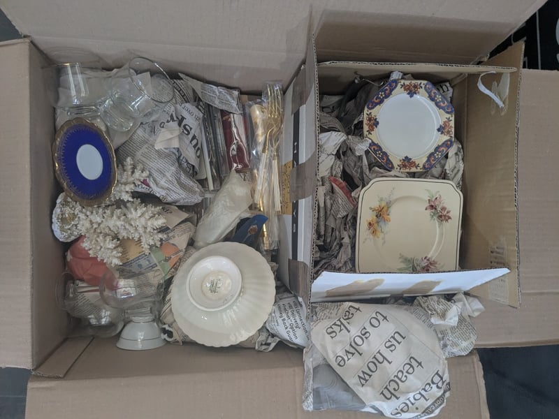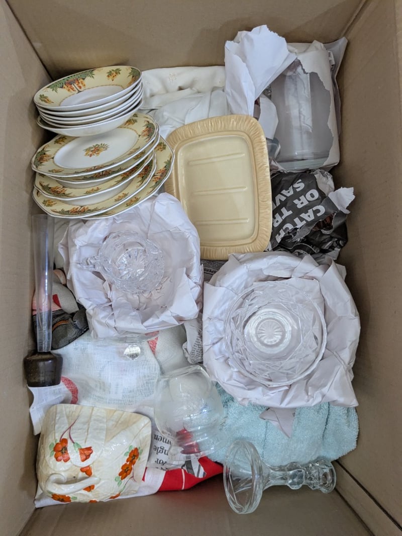 Kitchenware, 4 boxes including glassware, teacup sets, cutlery, ornaments