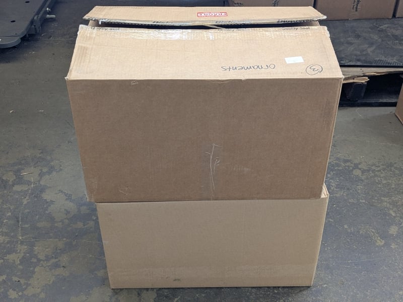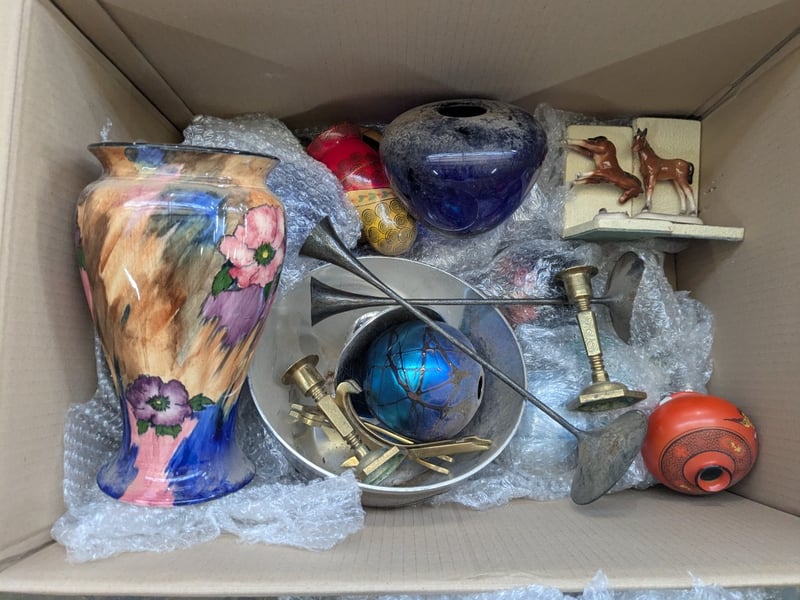 Ornaments, 2 boxes including vases, candle holders, rocks, shells and more Sold as lot