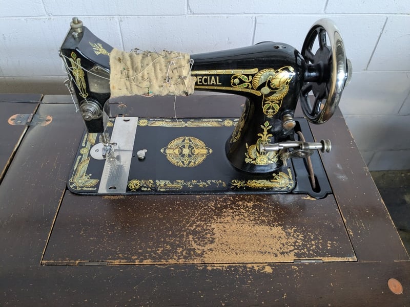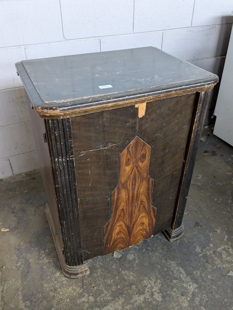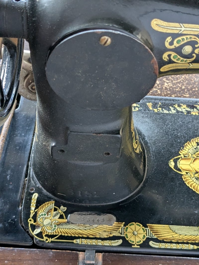 Sewing cabinet, including sewing machine with Egyptian decals Dimensions 79cm H x 61cm W x 44cm D
