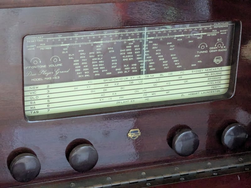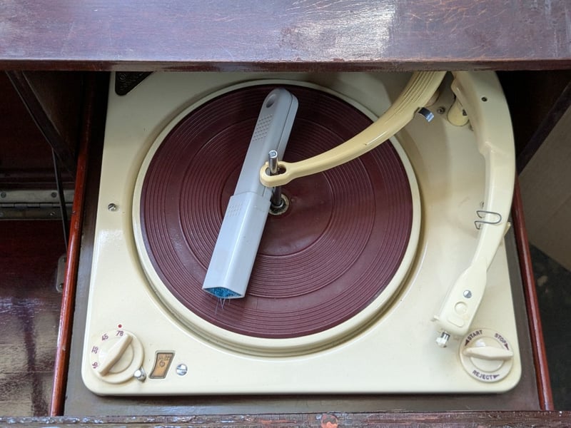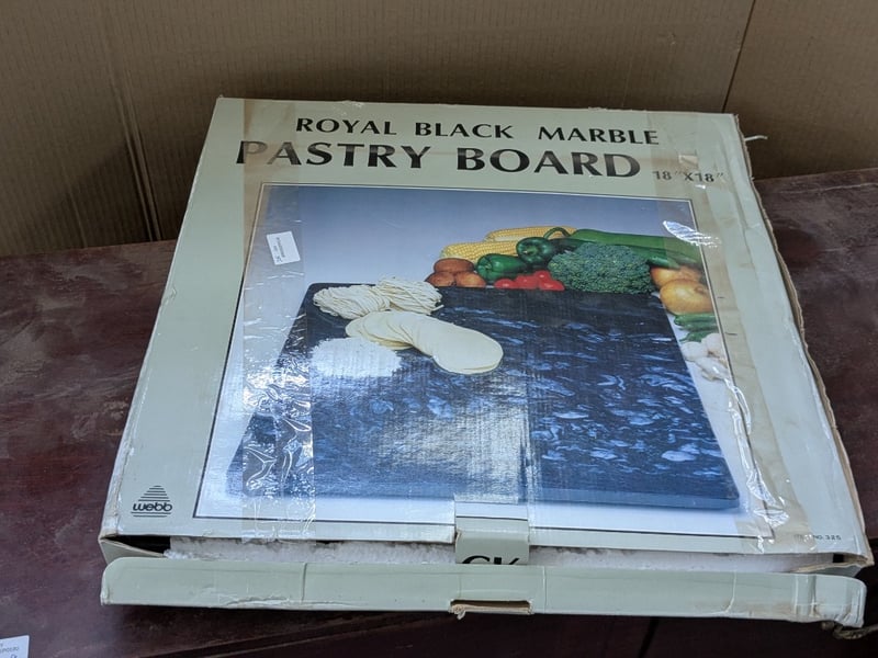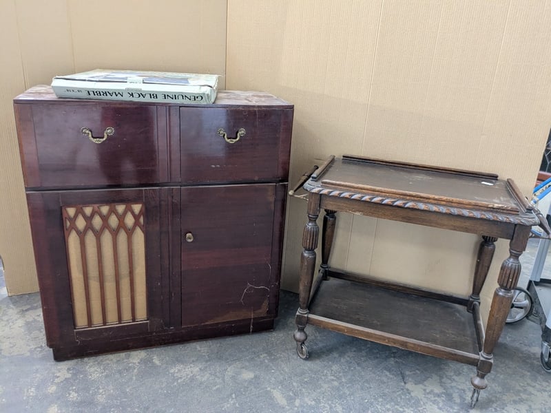 Homewares, includes timber style bart cart, 18x18 inch marble pastry board and Mullard stereogram Dimensions 99cm H x 91cm W x 42cm D Sold as lot