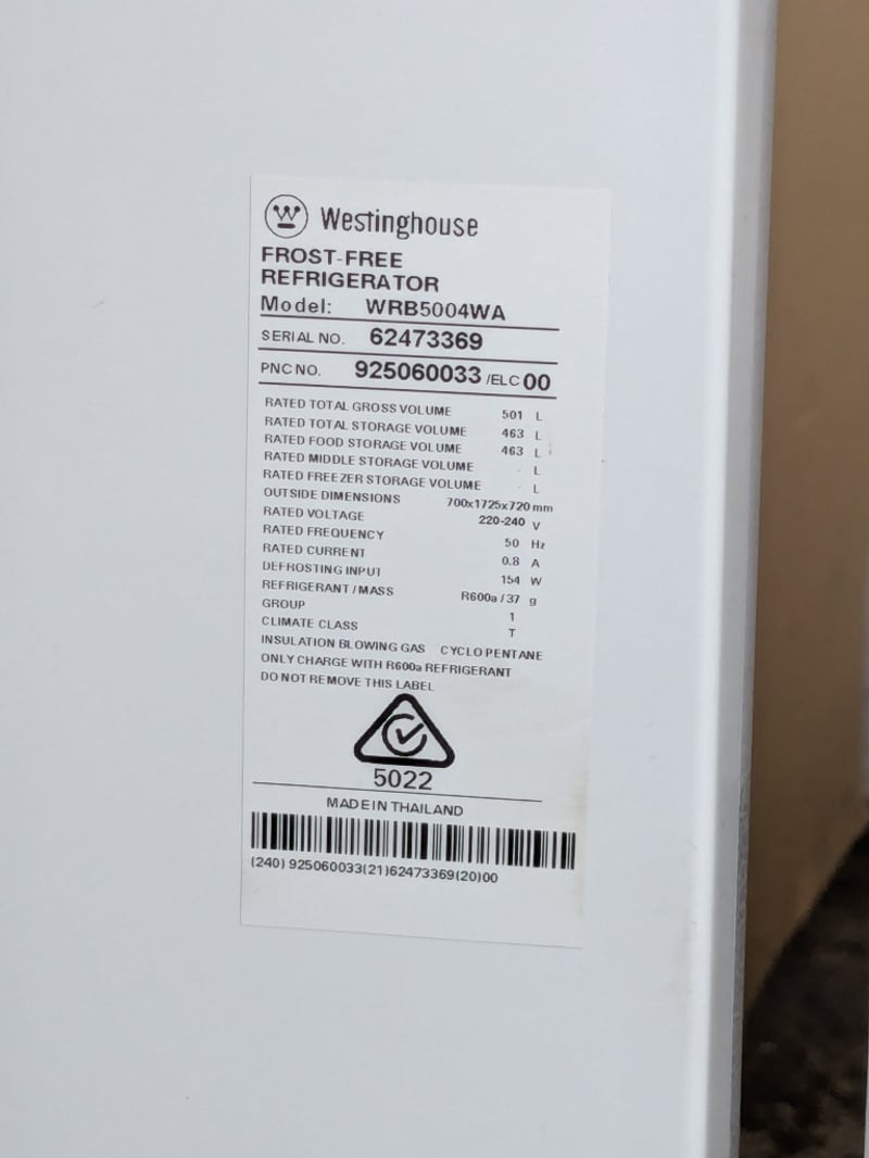 Refrigerator, Westinghouse 501L fridge model no. WRB5004WA